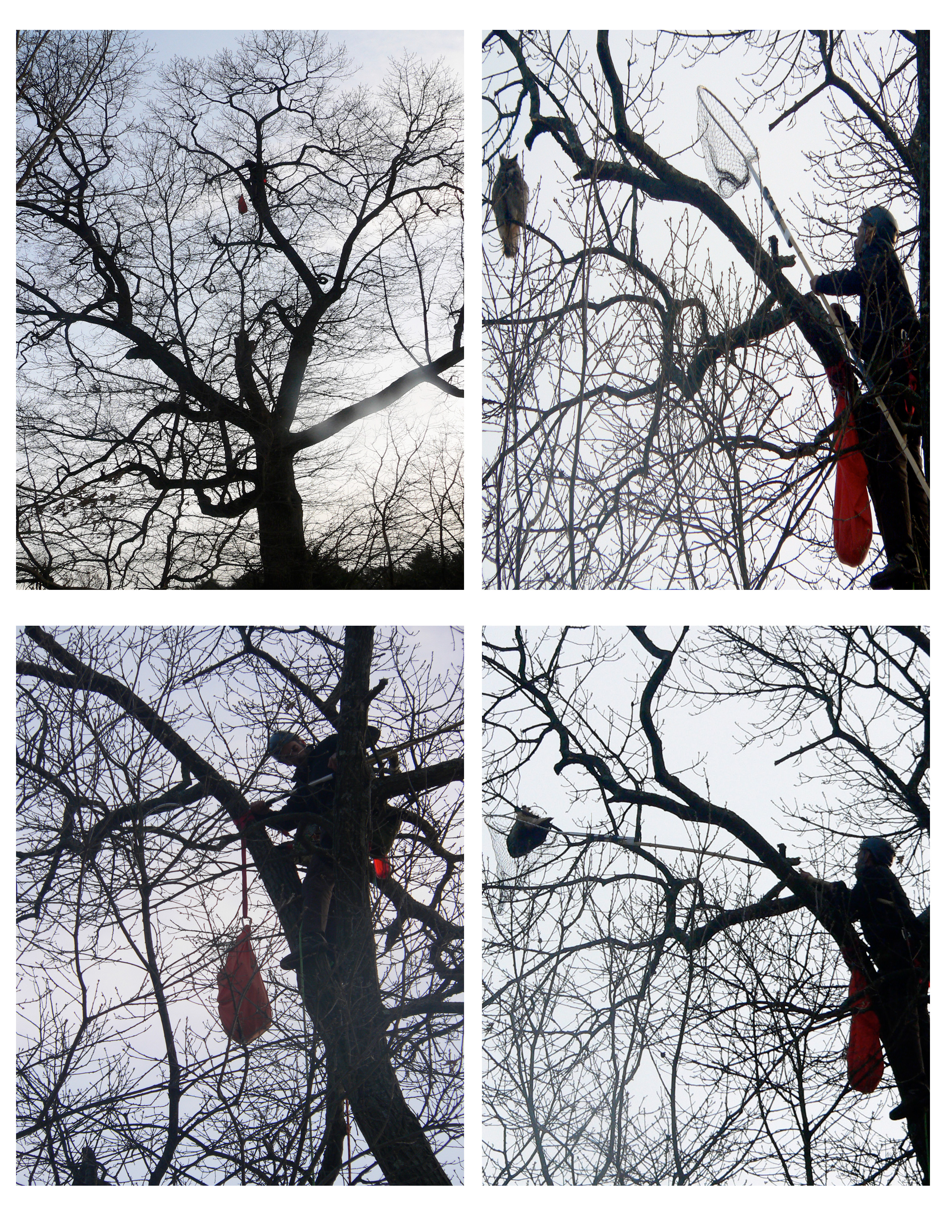 Capturing a Great Horned Owl. Clockwise from upper left: The tree with owl followed by the capture