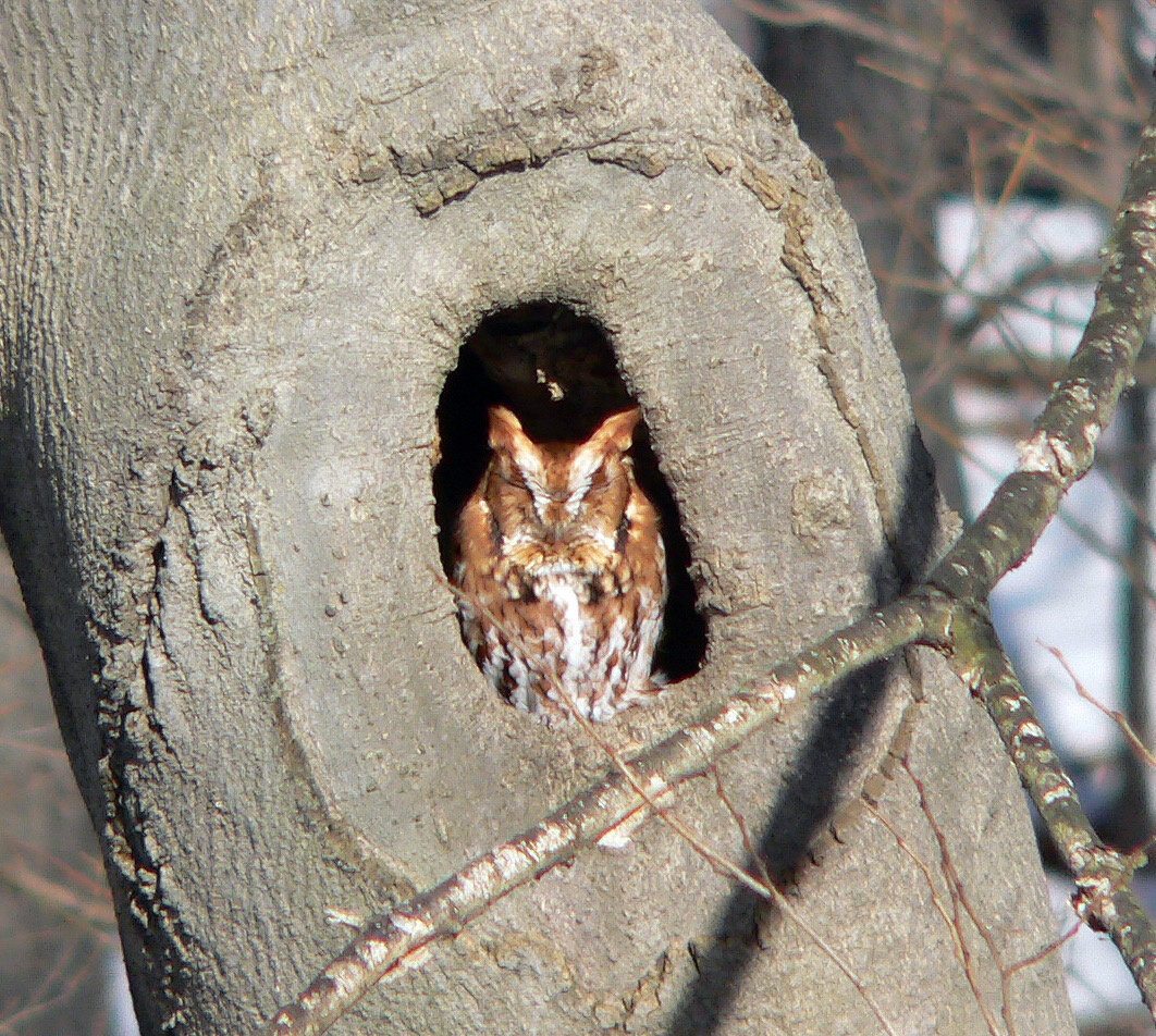 This is a red morph screech; others are gray. On the Christmas Bird Count in 2012 night-owl birders found four screech owls in the Arb by playing a recording of their calls before dawn.