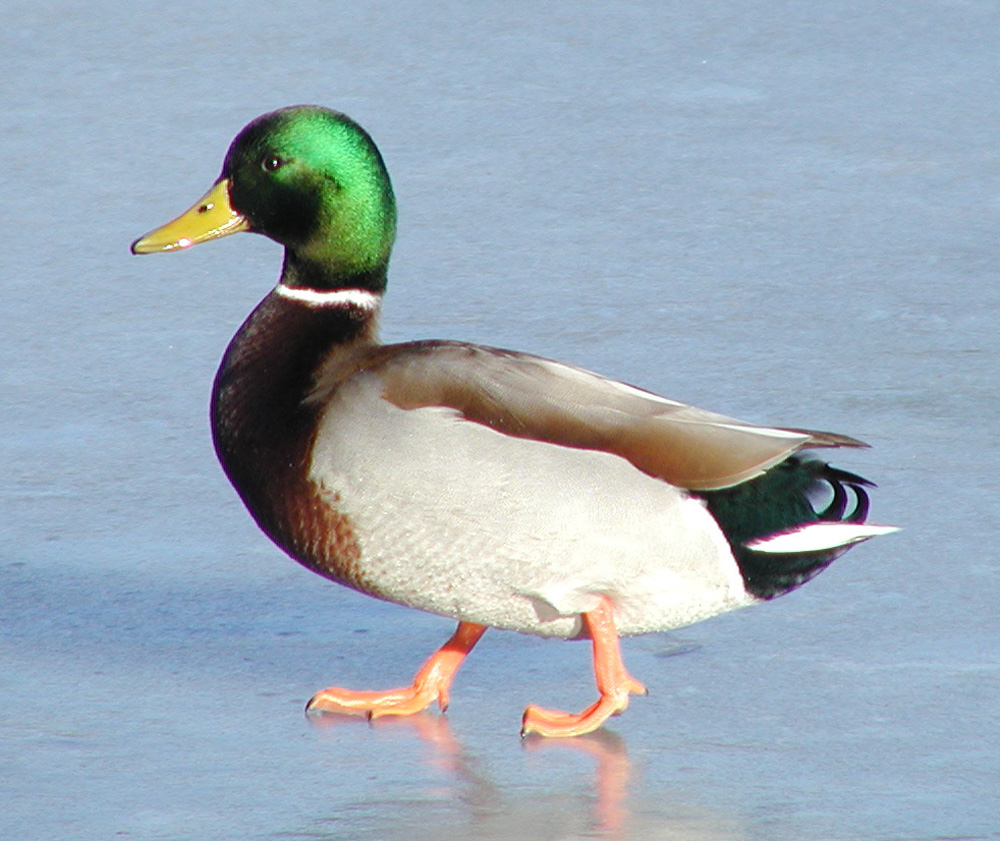 Feeding the waterfowl at the Pond is discouraged; a bread diet is no healthier for them than it is for us, and it encourages the ducks to hang around and foul the ground. However, as birds stream in from all over the pond for free eats, it is too tempting for children and loving grandparents to resist feeding them and so the practice persists. Here’s a shot of a male Mallard looking like a toy as he carefully negotiates his way across the ice: