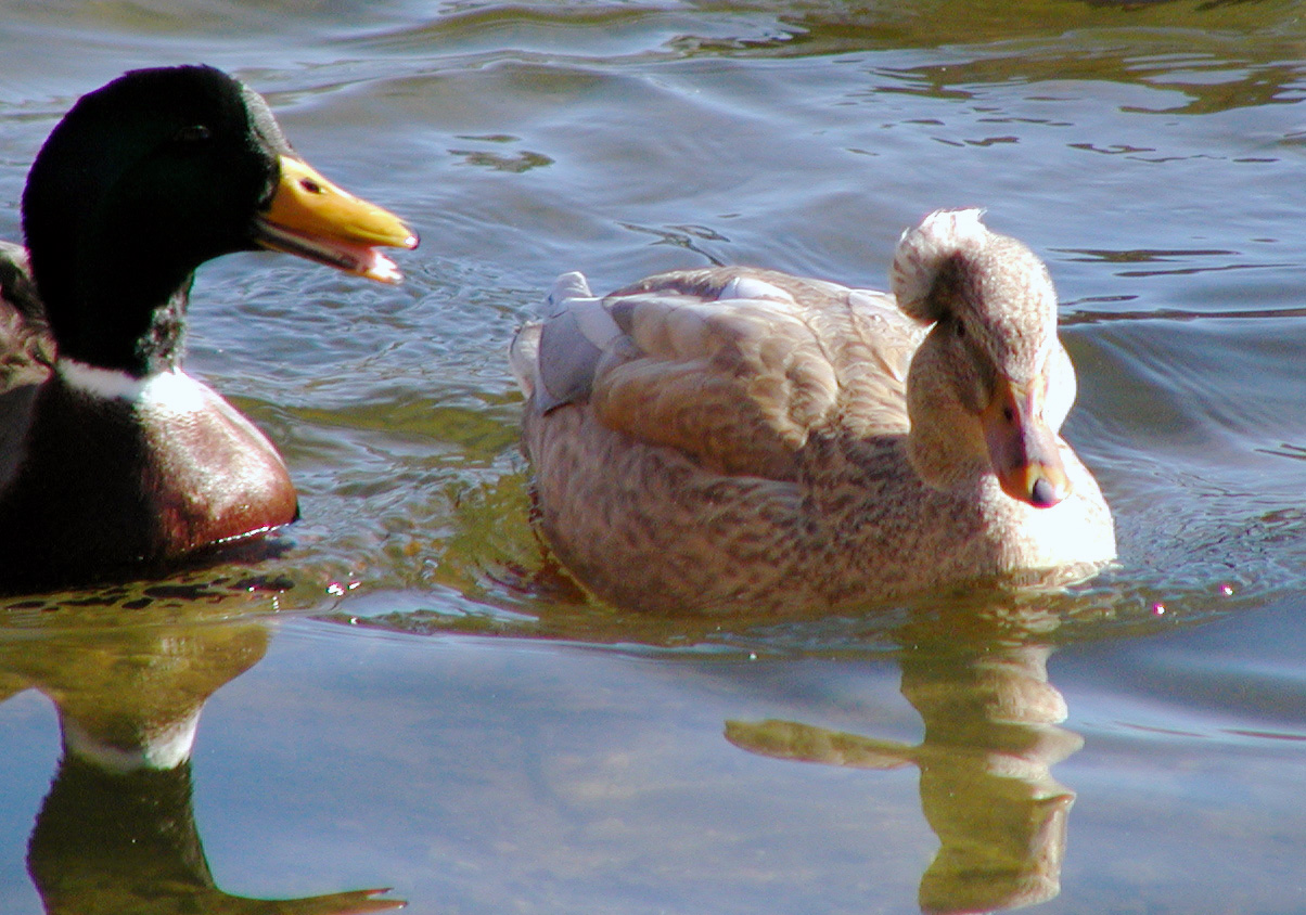 The females in most avian species are less colorful than their male counterparts. Males are generally the instigators in the mating season and have more need for fancy looks to gain attention and promote their gene pool. More importantly, the females usually manage the brooding and infant care and do that best if they blend into their surroundings. A favorite of mine on the Pond for many years was a female Mallard who was a partial albino (leucistic) and in addition had a very fancy “do”: