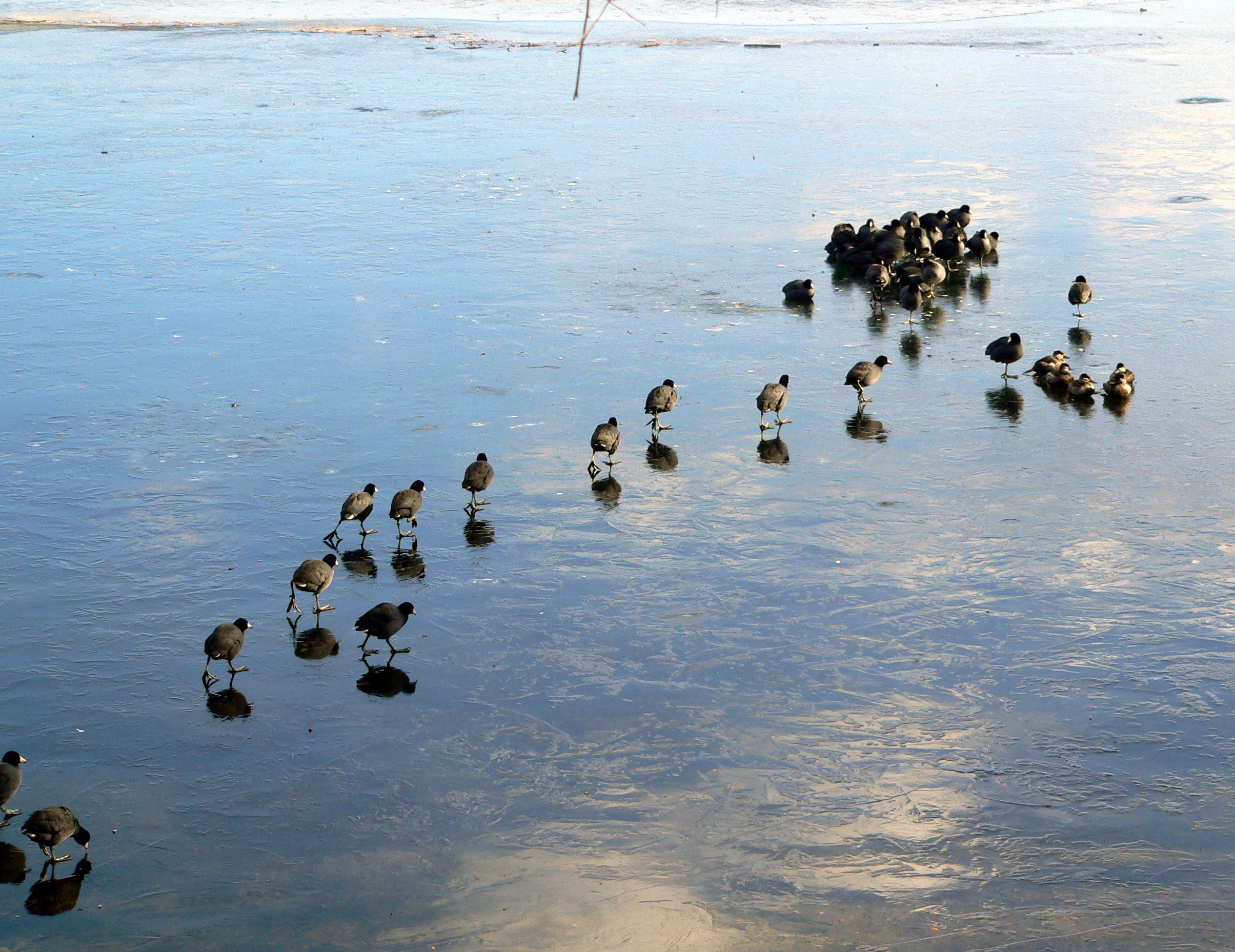 American Coots on a cakewalk as the pond ices over, a dangerous time for them, as they are vulnerable to attack from Great Black-backed Gulls. Photo: Bob Mayer