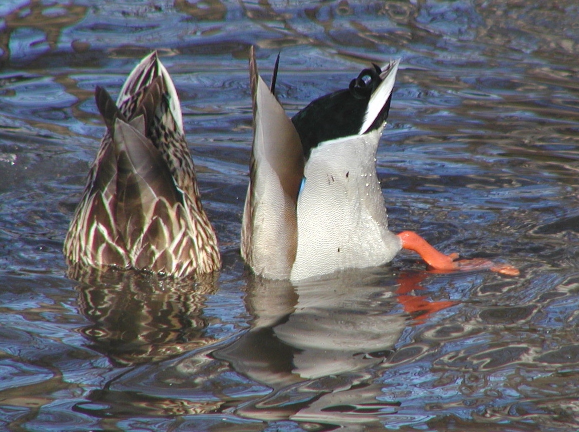 A pair of Mallards, bottom-up, as they reach for vegetation below the surface. Photo: Bob Mayer