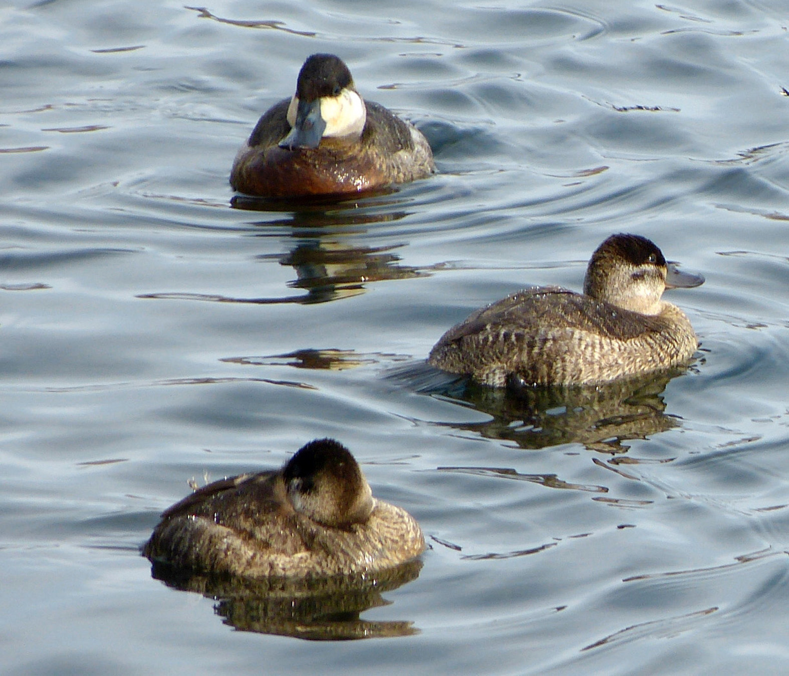 Two female Ruddies and a male (back) showing the more prominent white cheek patch and the bill beginning to develop the intense blue of a breeding duck. Photo: Bob Mayer