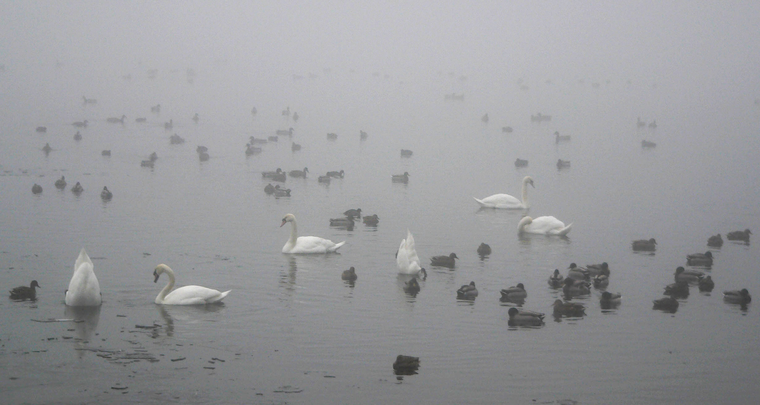 In the past The Boston Parks Department used to bring a pair of swans to the Pond—as they continue to do at the Public Garden— but most recently the Mute Swans seen here are part of the wild population. This winter there were two birds on the Pond most of the time. In December 2009 at least eleven were recorded. They can be a haunting sight in the fog of a winters day: