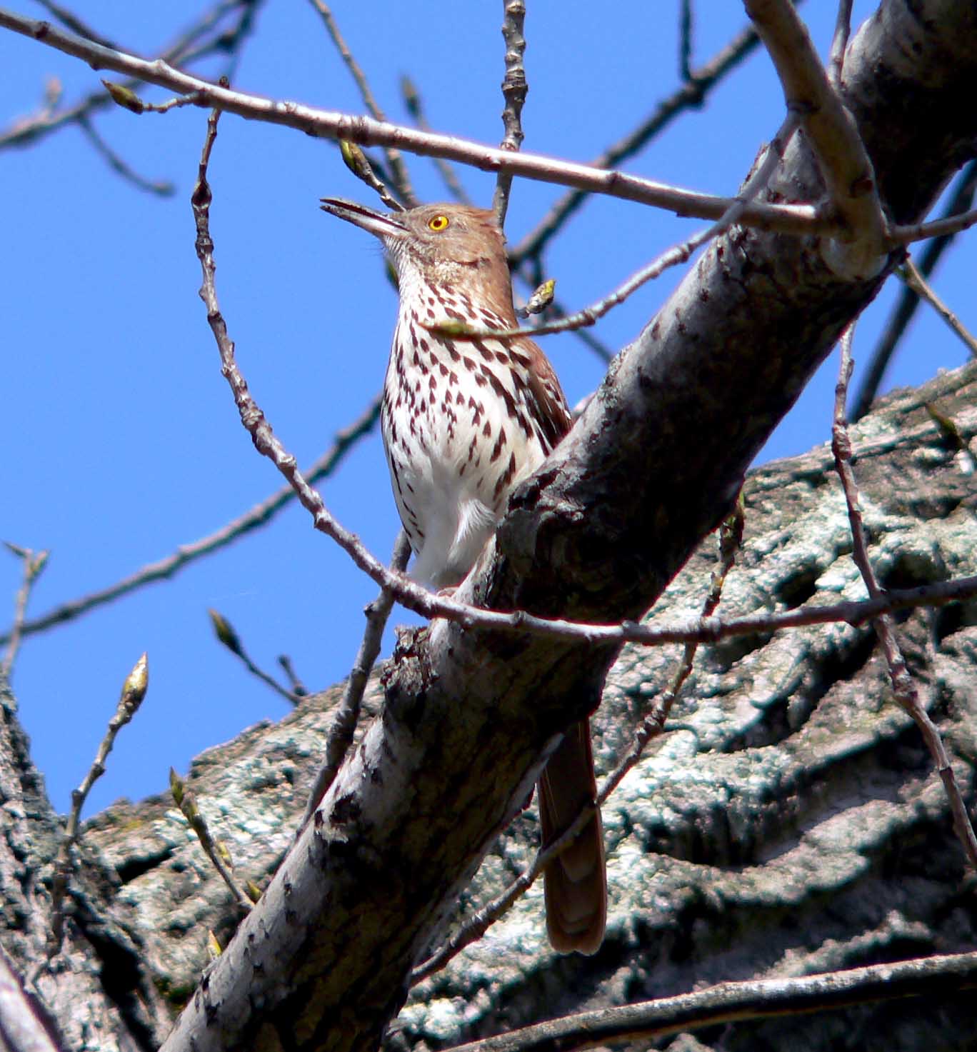Thrashers share their family with the more common Northern Mockingbird, a year round resident and famous mimic, and the Gray Catbird, which will not arrive in Boston for another week or so.