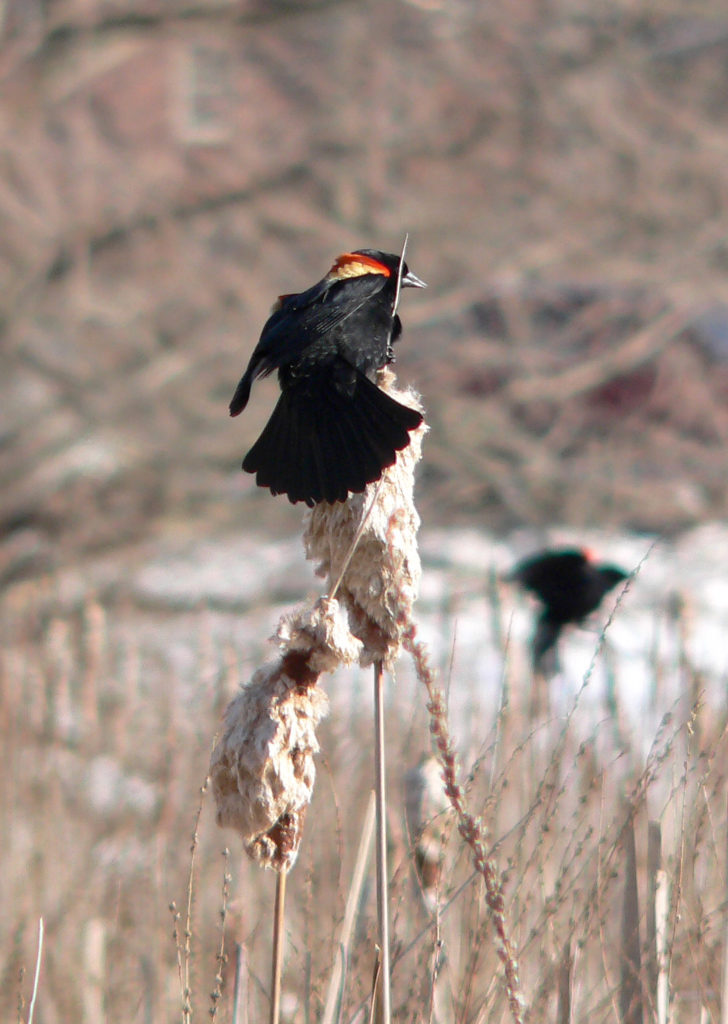Male Red-winged Blackbird displaying and calling to assert/establish territory. A second one is visible in the background. Photo: Bob Mayer