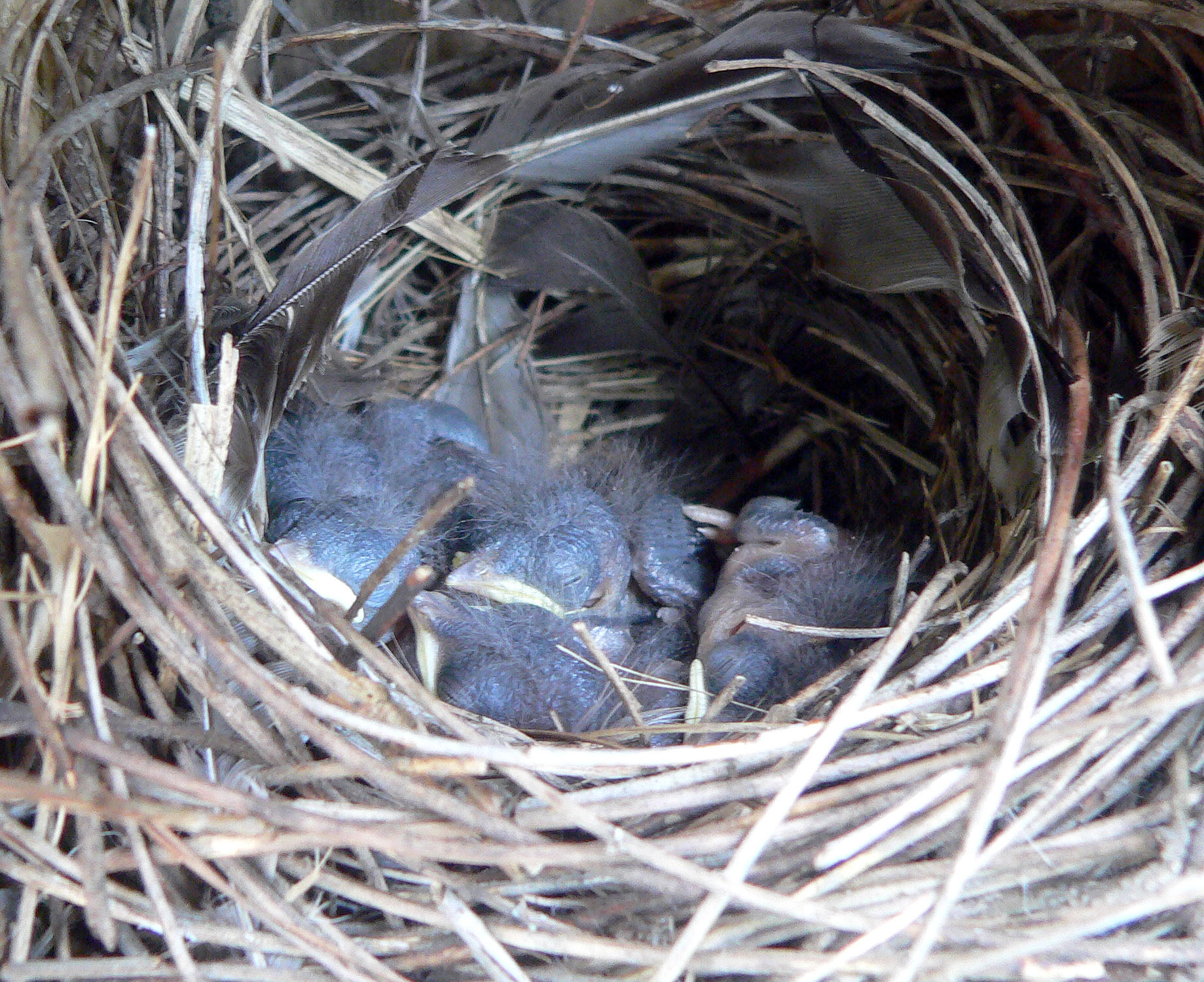 House Wren nestlings. The stick nest is typical of the species. This image was taken in 2006 during a survey of nest boxes. No birds were harmed during this survey!