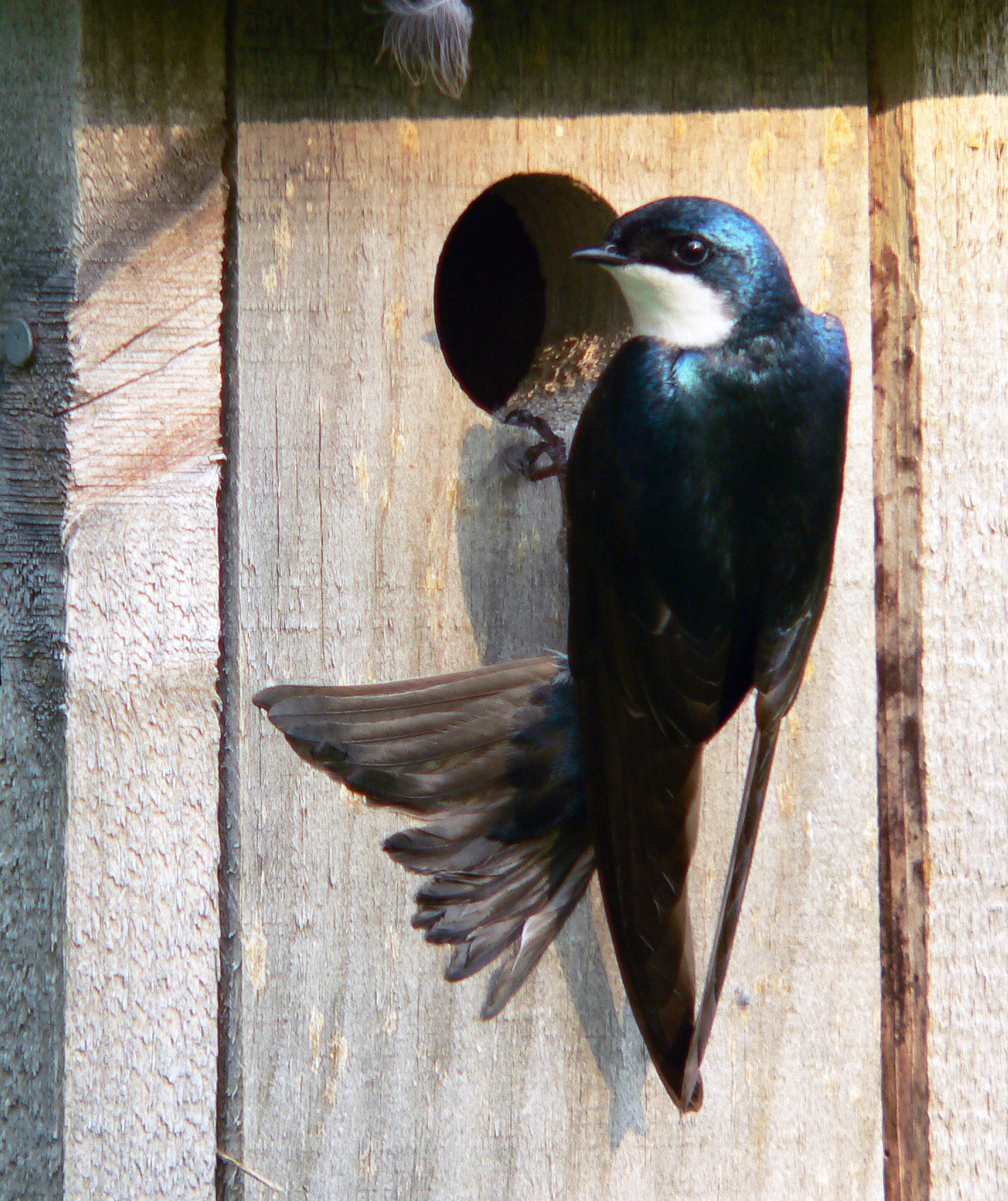 On a scouting trip earlier in the week I located a new oriole nest just above the path, but today it couldn’t be found; perhaps a victim to strong winds lately. We did however find an active robin nest, and watched two Mourning Doves building a nest as well. The diverse habitat of Bussey Brook Meadow and marsh provides nesting territory for at least two dozen species of birds. In addition, nest boxes erected there are regularly used by Tree Swallows; we watched a pair enter and leave one box: