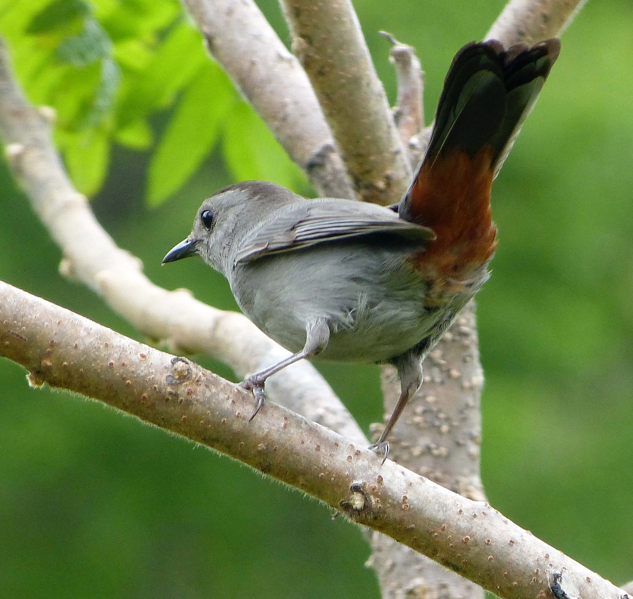 Gray Catbird showing off it’s “butt”. The official name is undertail coverts.
