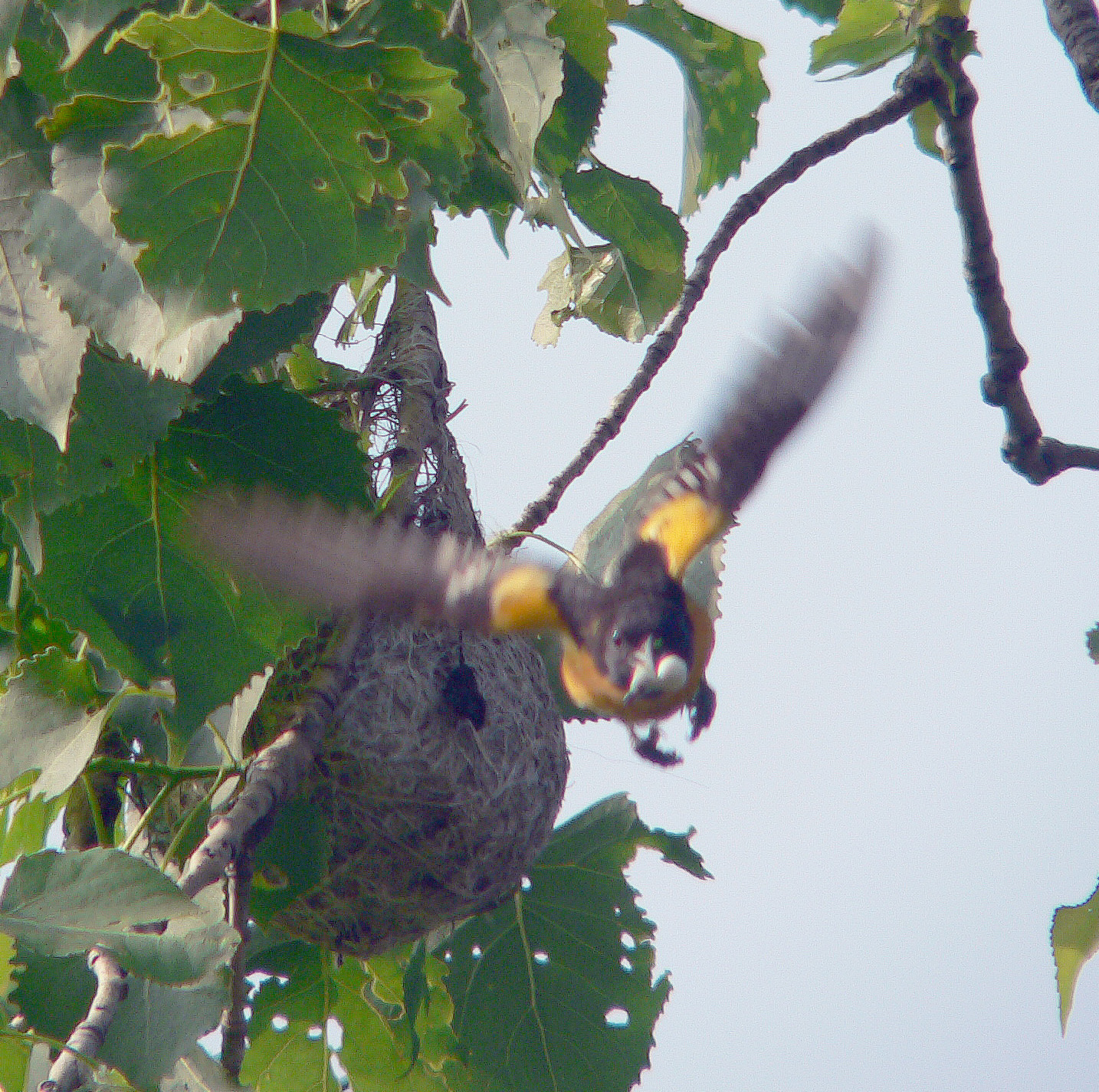 An oriole captured taking out the trash. If you look closely he has a “fecal sac” in his bill; removing fledgling waste from the nest behind, to deter odors that might give the nest away to predators.