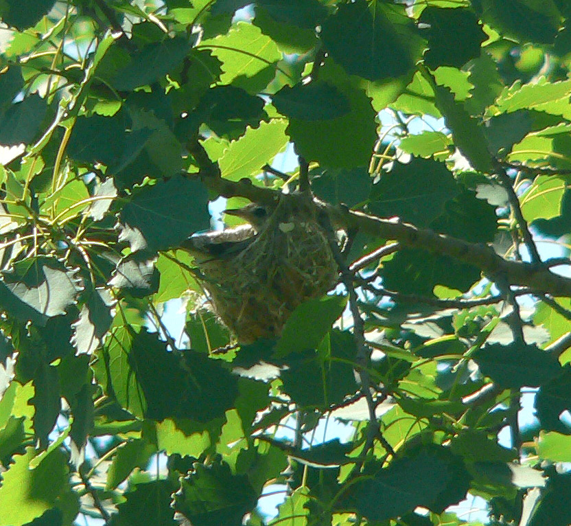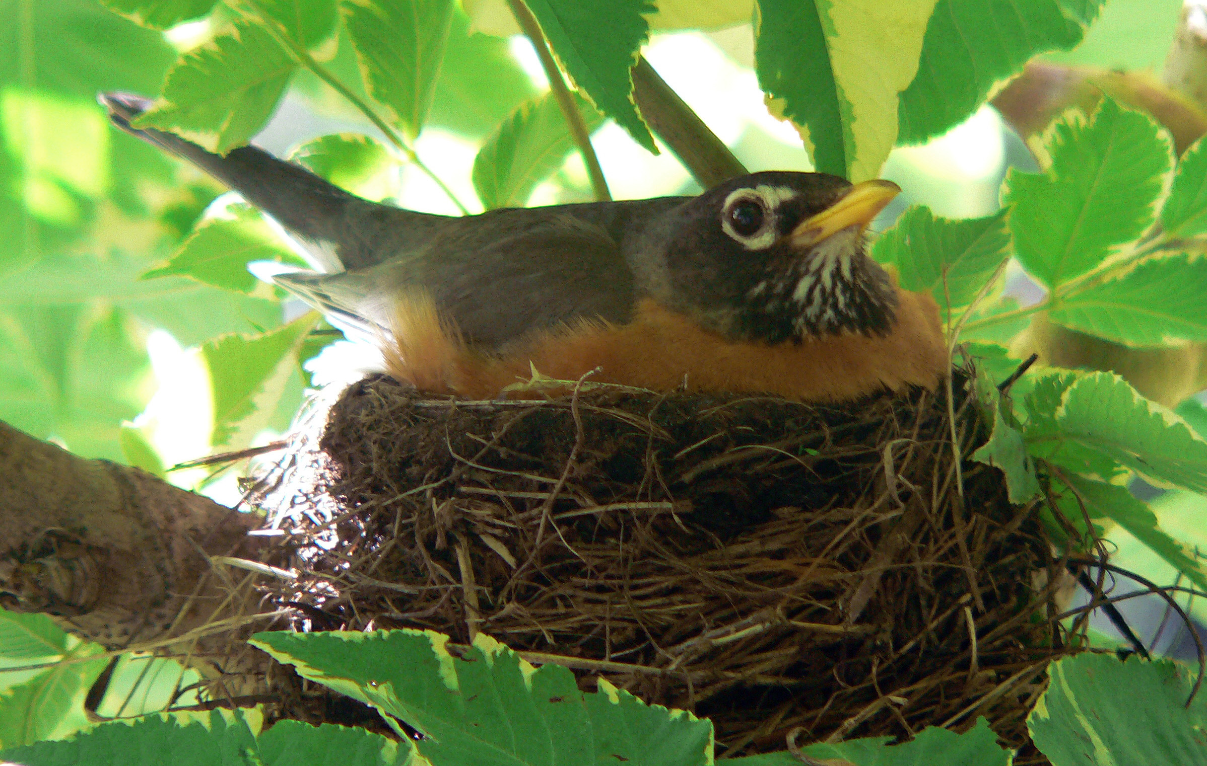 American Robin on nest. Robins build heavy nests often low down in the landscape.