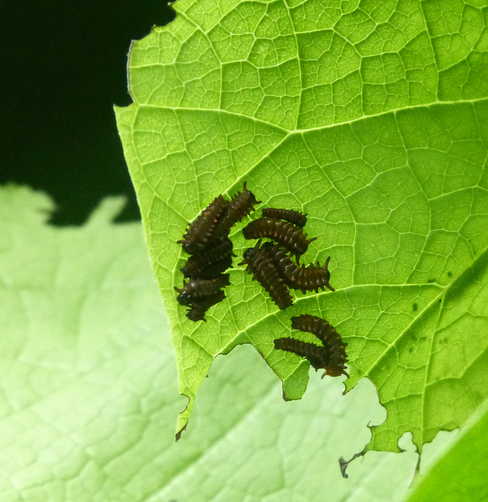 Suddenly my rare discovery seemed mundane. Maybe this swallowtail was pretty common, but no one bothers to report it to obscure websites. I backed off my high to gather some perspective. I had never seen it, and I’ve been looking at butterflies for many years. A cursory review of MassLep reports in the last few years revealed only 3 reports, and they were HIGHLIGHTED in each case. So yes, this was a rare sighting, but perhaps the Arboretum, with it’s abundant pipevine plantings, may be a local mecca for this lep. In fact, when I made a presentation on site about my find recently, one of the attendees reported he had seen what he thought might have been a Pipevine Swallowtail as he approached the meeting site. I pointed out that other more common black butterflies were more likely. But after the meeting some in the group went with him to where he had his sighting and found and photographed the creature. After review, the image turned out to be our index swallowtail! I’ve been back a number of times to follow the development of the eggs and have seen several more likely suspects in flight but have not been able to confirm their identification.