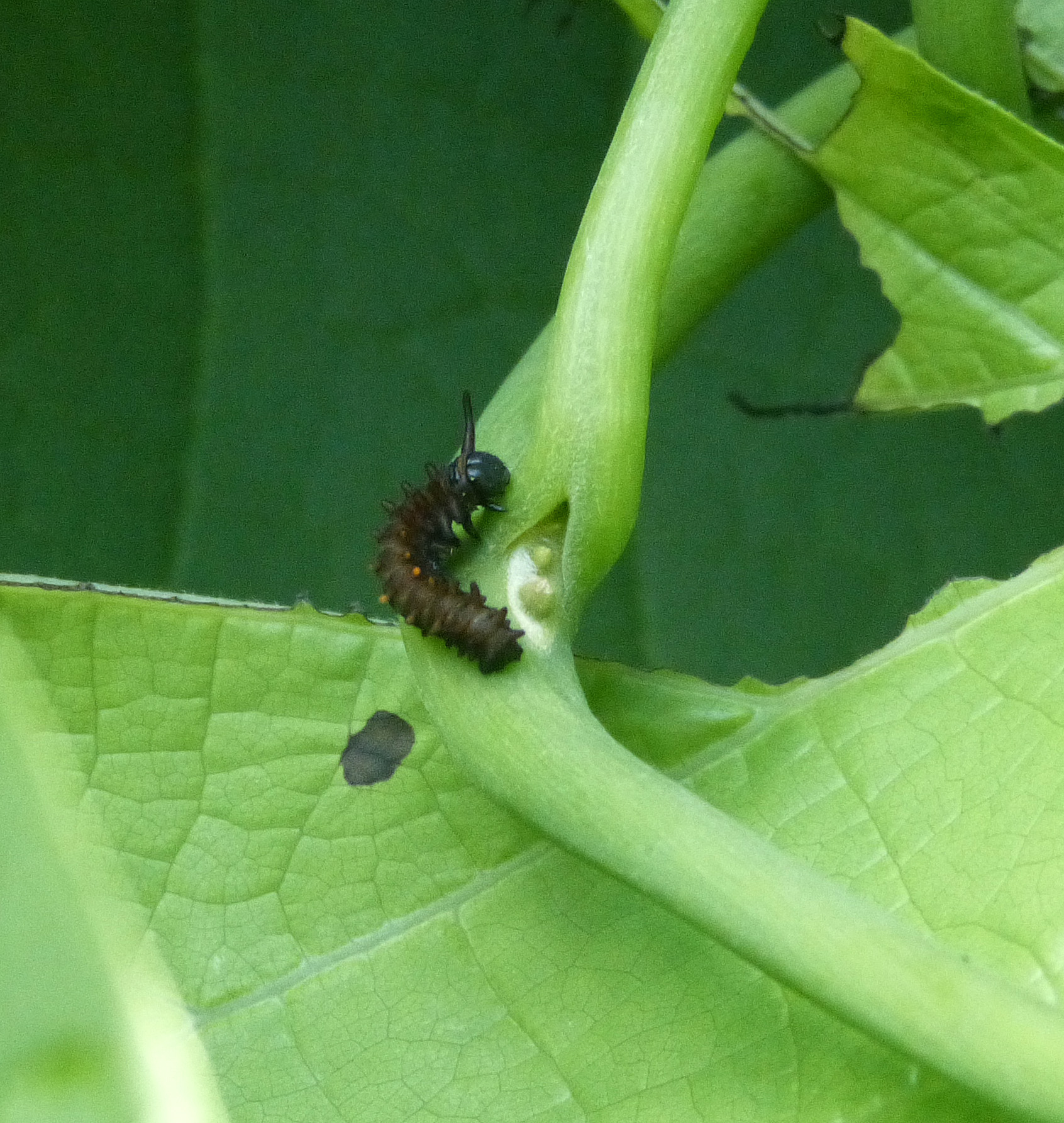 The Arboretum has a number of these vines growing on the chain link fence surrounding the garage near the main entrance. I’ve searched them every summer since I learned of the swallowtail connection- in vain. But this time I spotted something interesting fluttering around the massive leaves of Aristolochia macrophylla: