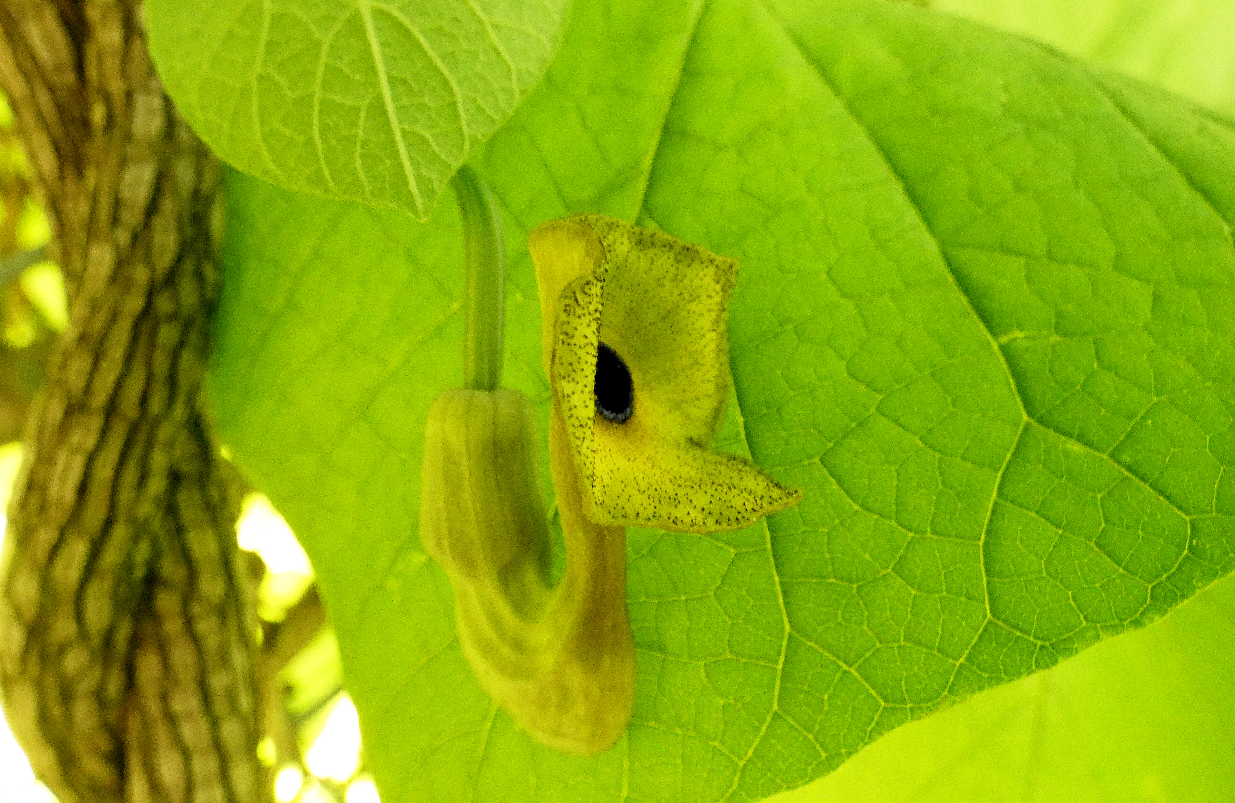 Early in July I went to the area where I thought I would have the best odds of finding a Pipevine Swallowtail. Pipevines, like most butterflies, have specific plants on which they lay their eggs, so called host plants. Most plants produce toxic substances to reduce their chance of being eaten by predators like the caterpillars of moths and butterflies. To get around this defense, butterflies evolved over time a resistance to the toxins of one or more plant types; they aren’t deterred by the poison and in fact benefit from eating it because they in turn take the nasty toxin into their bodies thus protecting them from being eaten by birds or other predators. Many butterflies have several host plants; the Pipevine has only one, the genus Aristolochia or Dutchman’s Pipe, named for it’s flower which is thought by some to resemble a meerschaum pipe: