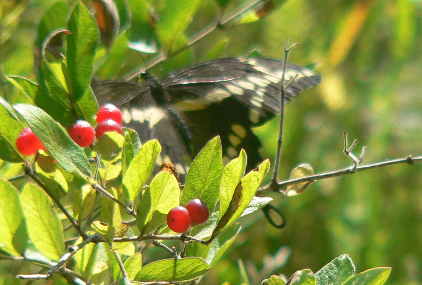 Giant Swallowtail Papilio cresphontes. Although this is a very poor photo, it is enough to confirm the identity of the specimen. The yellow spot within the tail, seen to the right of the lower berries, is diagnostic.