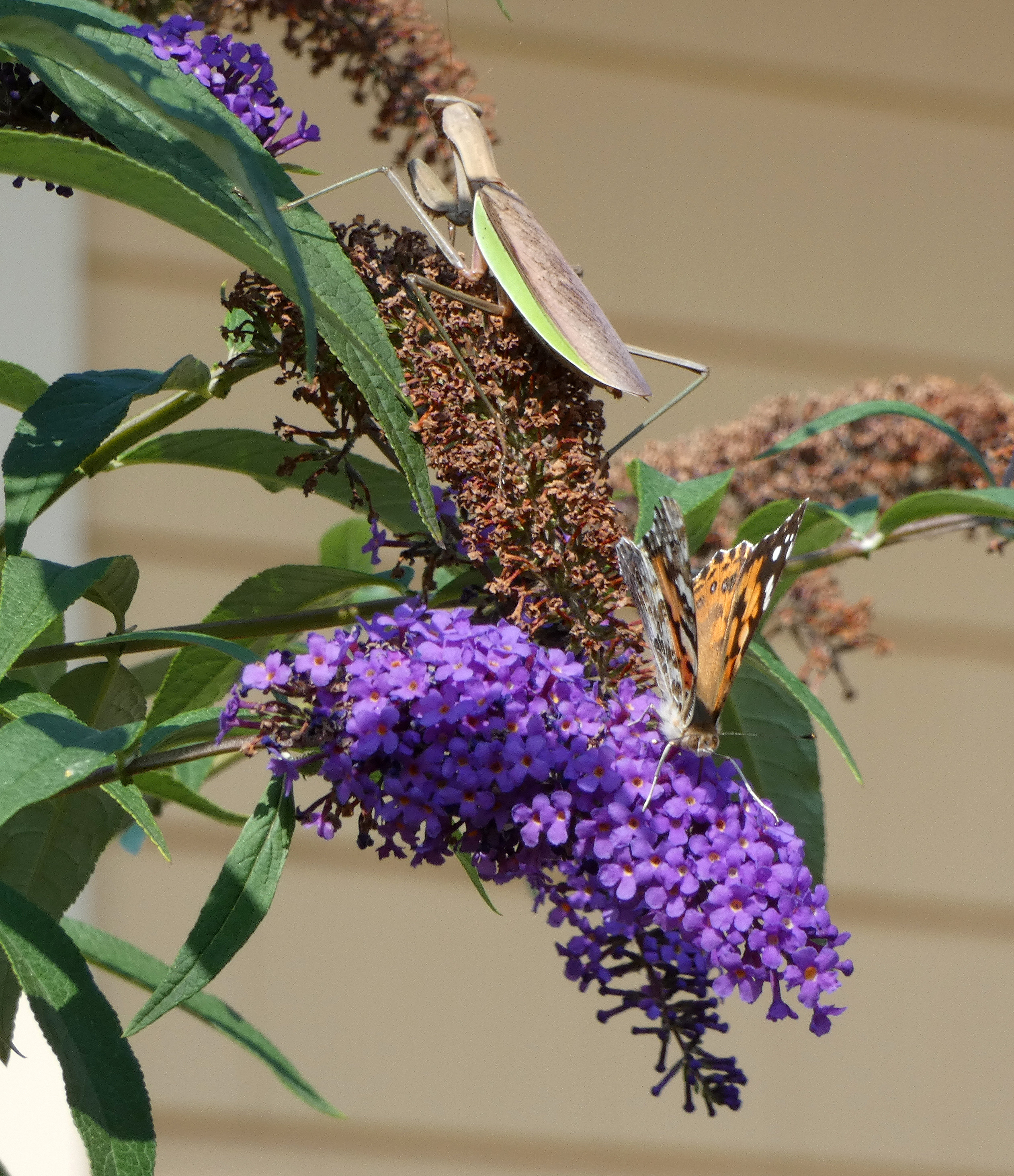 With this photo I was documenting a Painted Lady Vanessa cardui butterfly, one of hundreds migrating through Boston right now, on a Butterfly Bush at the Boston Nature Center. Only when I got home and uploaded the image on my computer did I notice the Praying Mantis Mantis religiosa above. Camouflage or inattention?