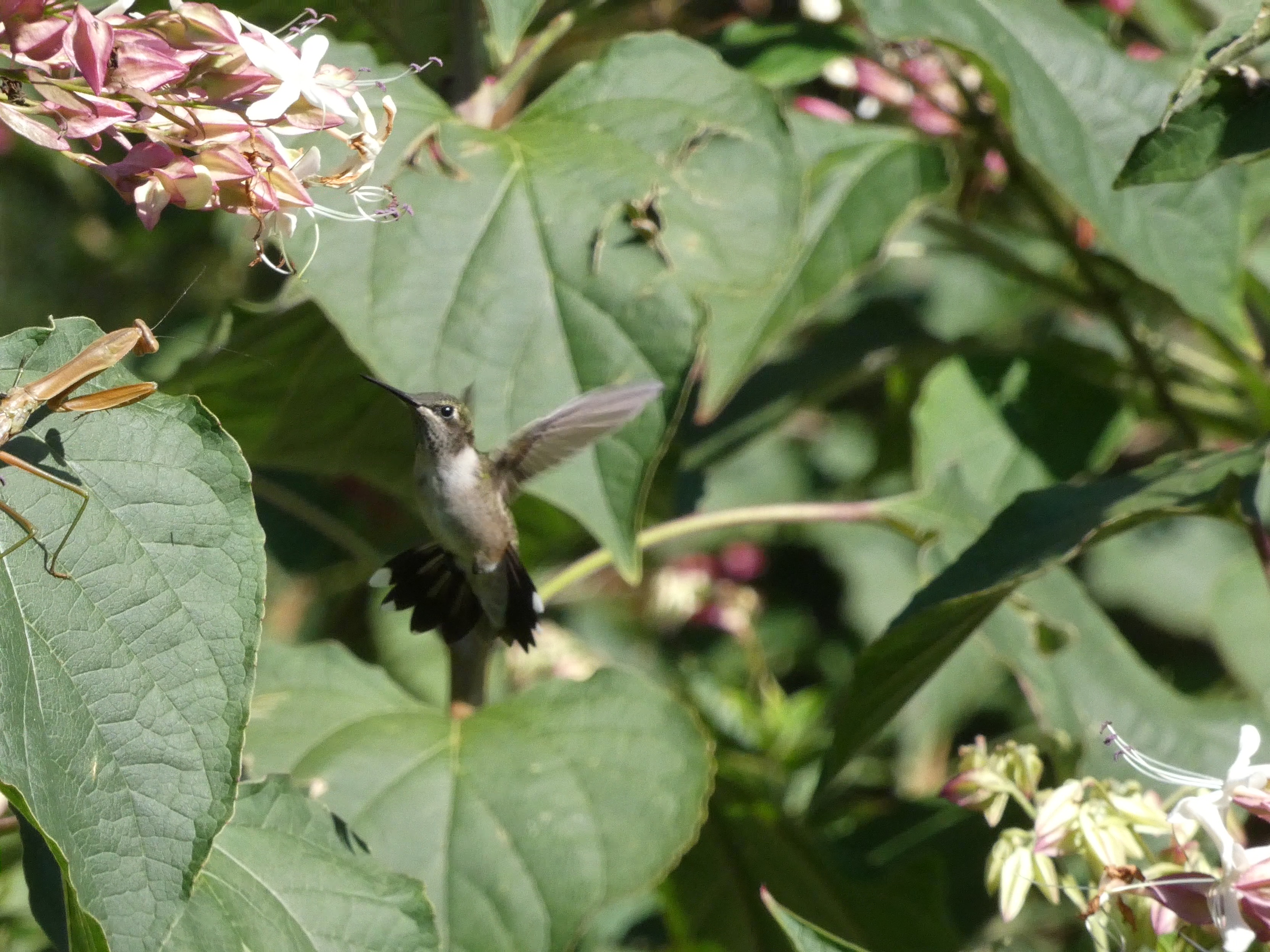 In my last post on the Pipevine Swallowtail caterpillars I also included three images of a female Ruby-throated Hummingbird that I photographed on the same Harlequin Glorybower bush that harbored the Pipevine butterfly. A keen 11 year old observer from Maine contacted me, kindness of her grandmother, to point out something in the images I had completely missed. On the left side of the pictures the head, thorax and powerful front leg of a Praying Mantis are clearly visible: