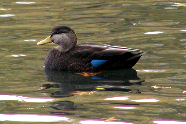 American Black Duck; darker and a bit larger than the Mallard female, and with a greenish-yellow bill. Note also the bright blue speculum on the wing without a white lining.