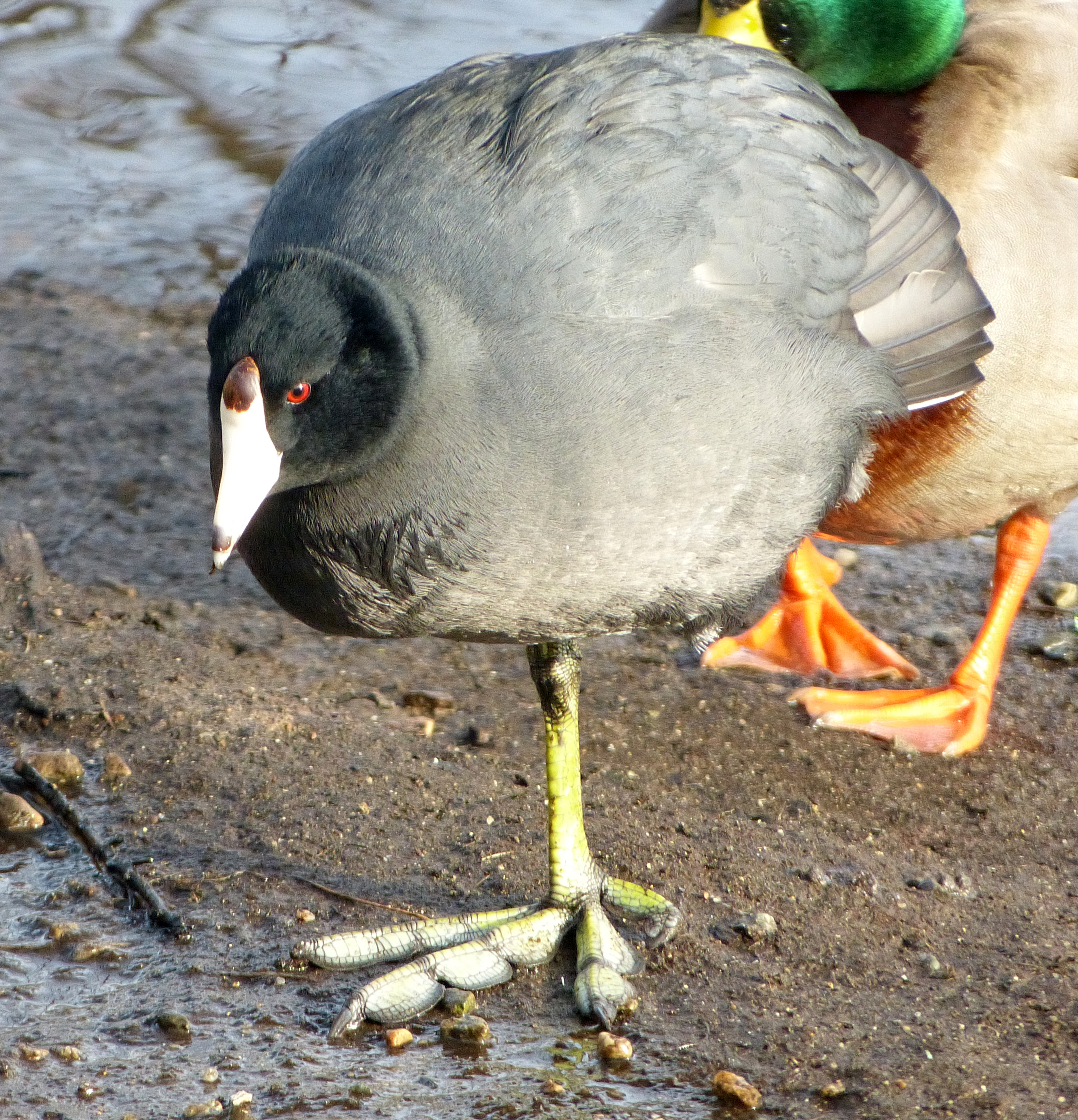 Note the lobed toes and sharp white beak on this American Coot, in contrast to the webbed feet and broad bill on duck species.