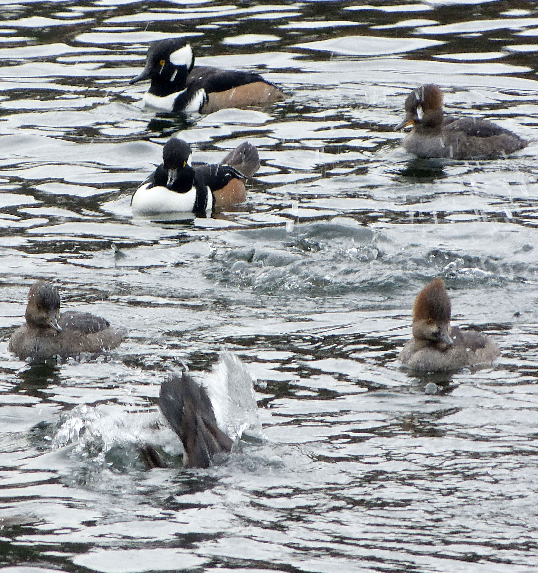 Mixed in with the large flotilla of ducks on the pond were several Hooded Mergansers, cavorting with each other: