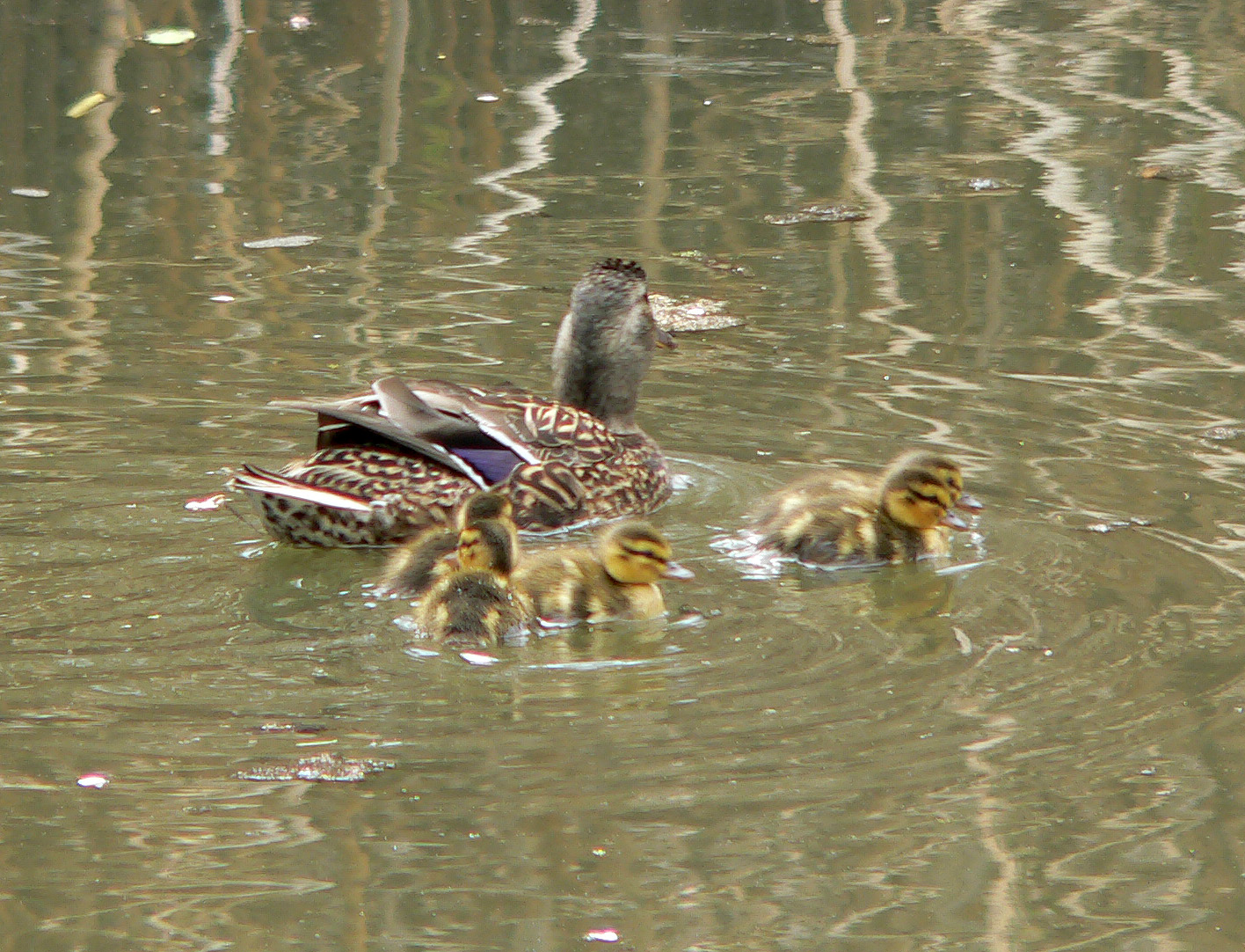 This shot of a female Mallard with chicks shows the different bill color, the overall lighter appearance and the white lining on the wing speculum.