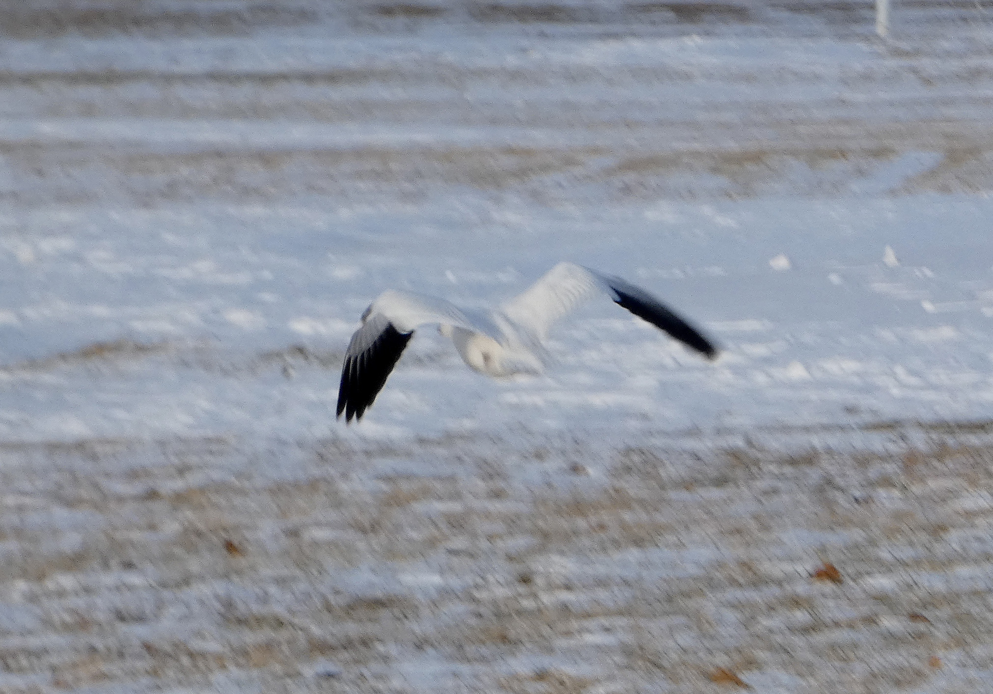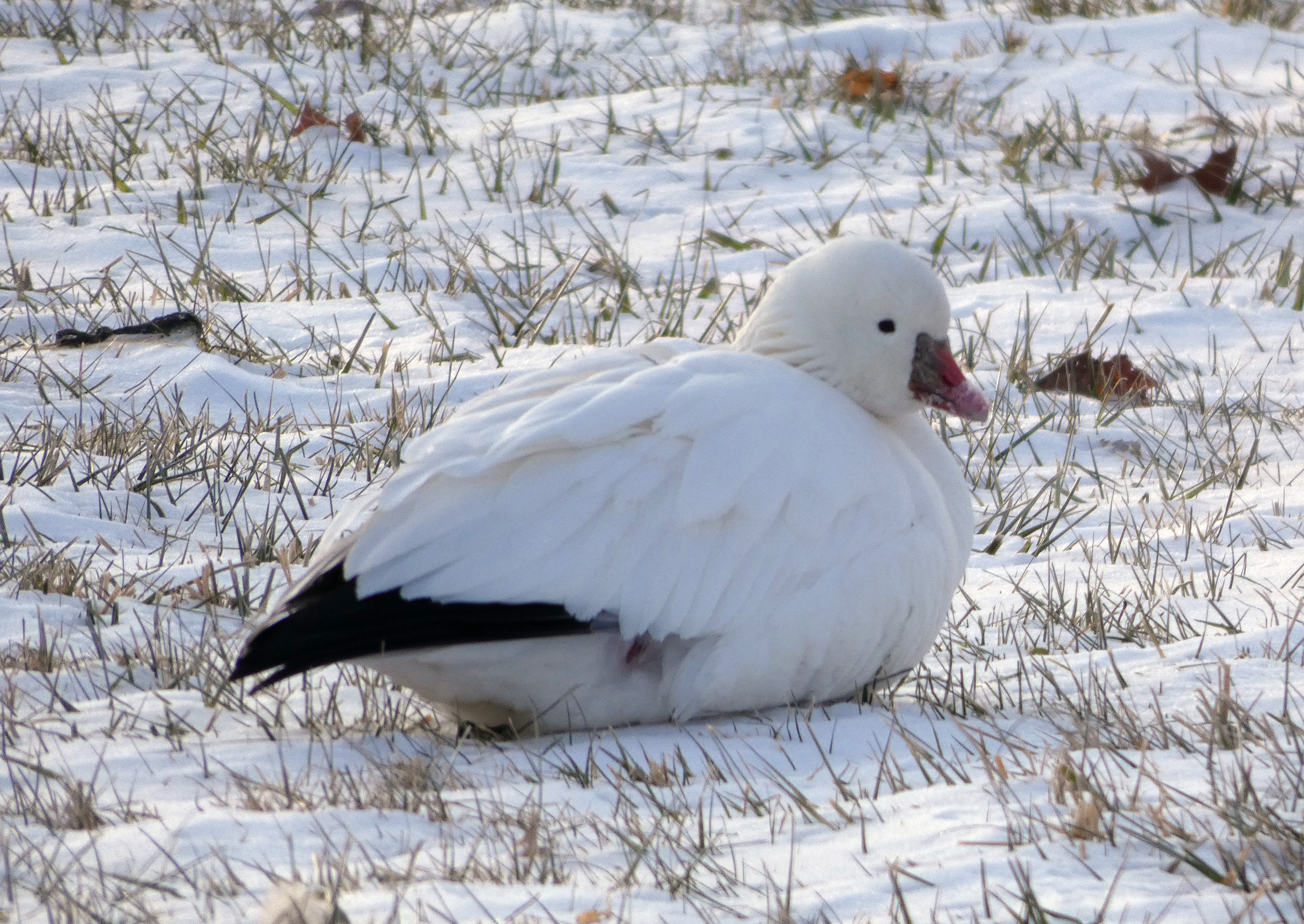 Ross’s Goose. A small white goose with black primaries and tiny triangle pink bill. These geese are common in California, but very rare on the Atlantic Coast.