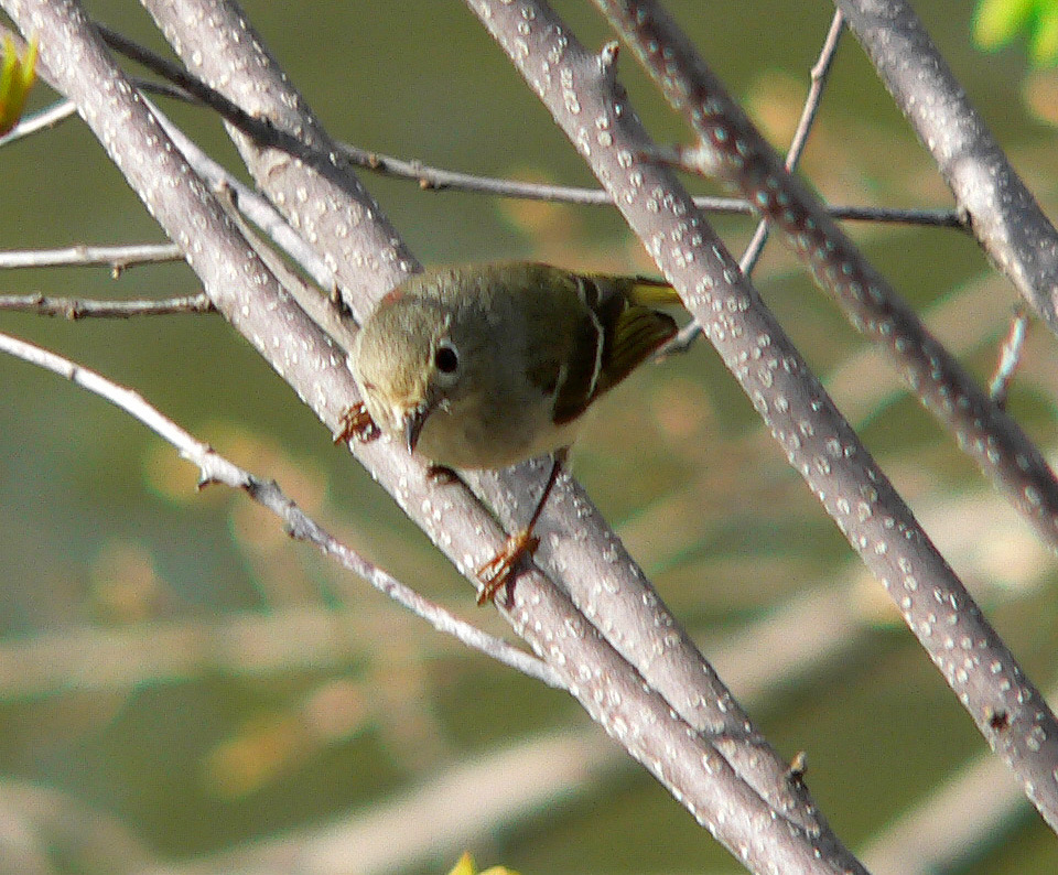 Ruby-crowned Kinglet. Note the partial white eye ring and otherwise plain head; usually just a hint of the crown is visible as in this image. Photo: Bob Mayer