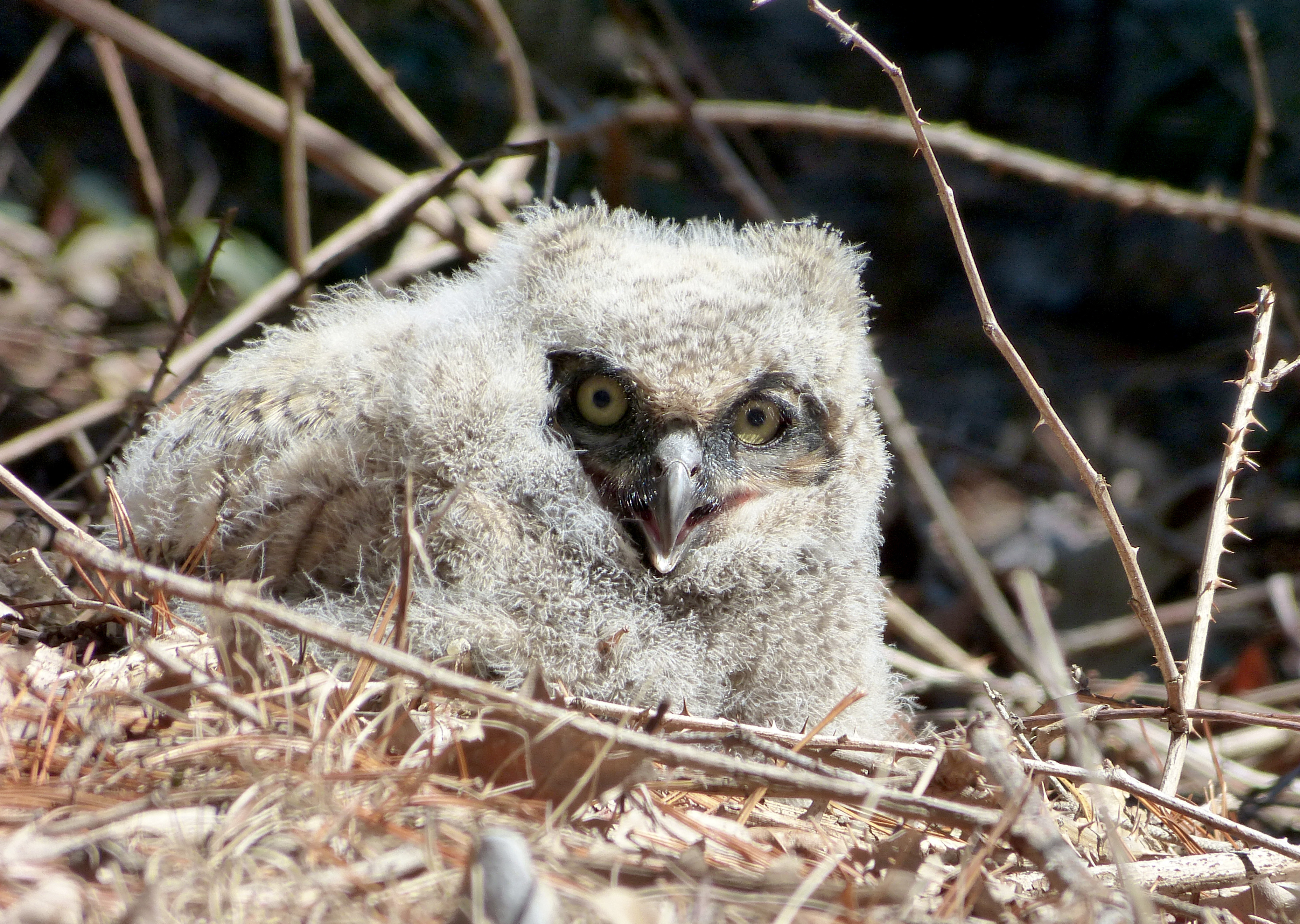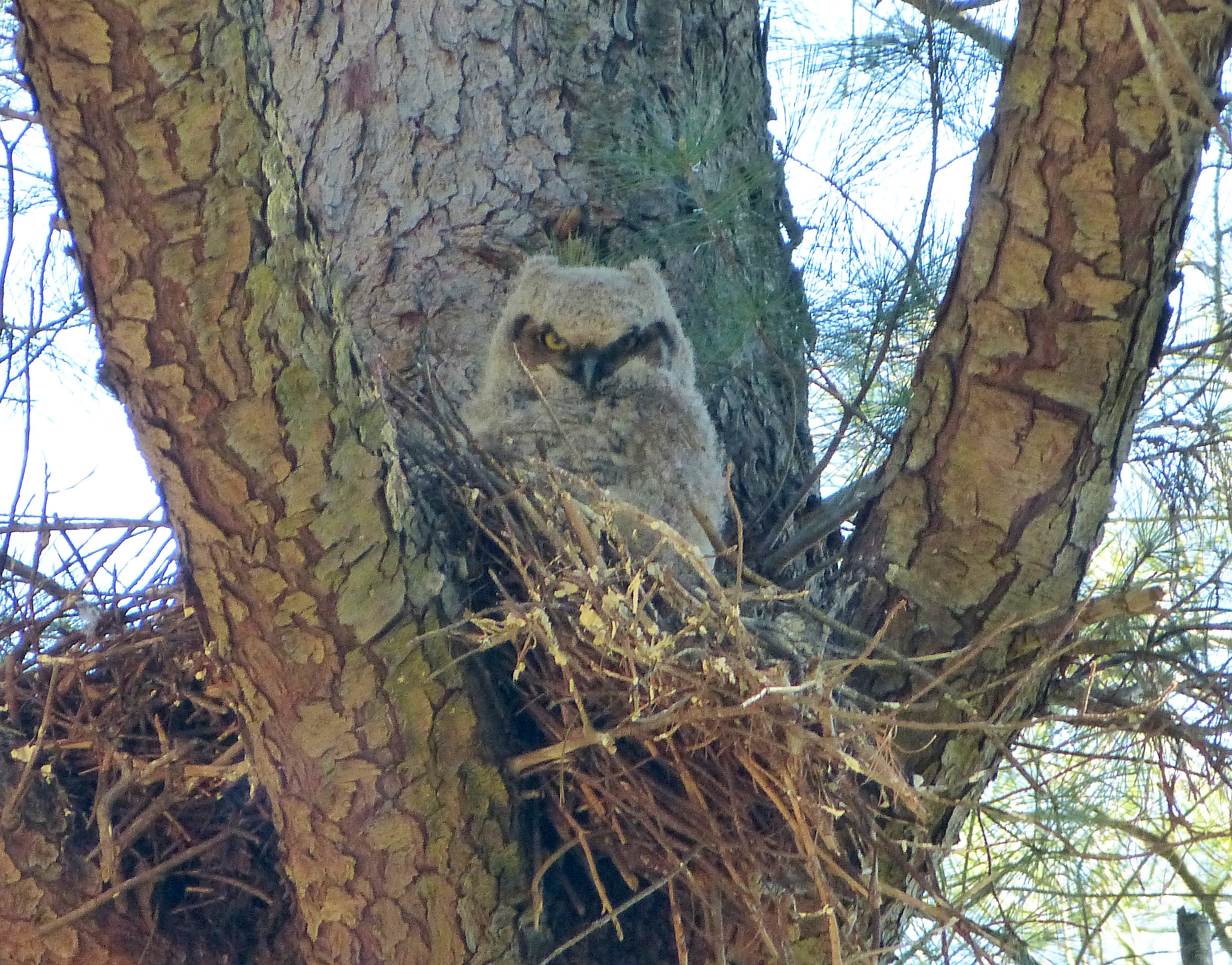 The smallest of the trio of baby Great Horned Owls, still on the nest.