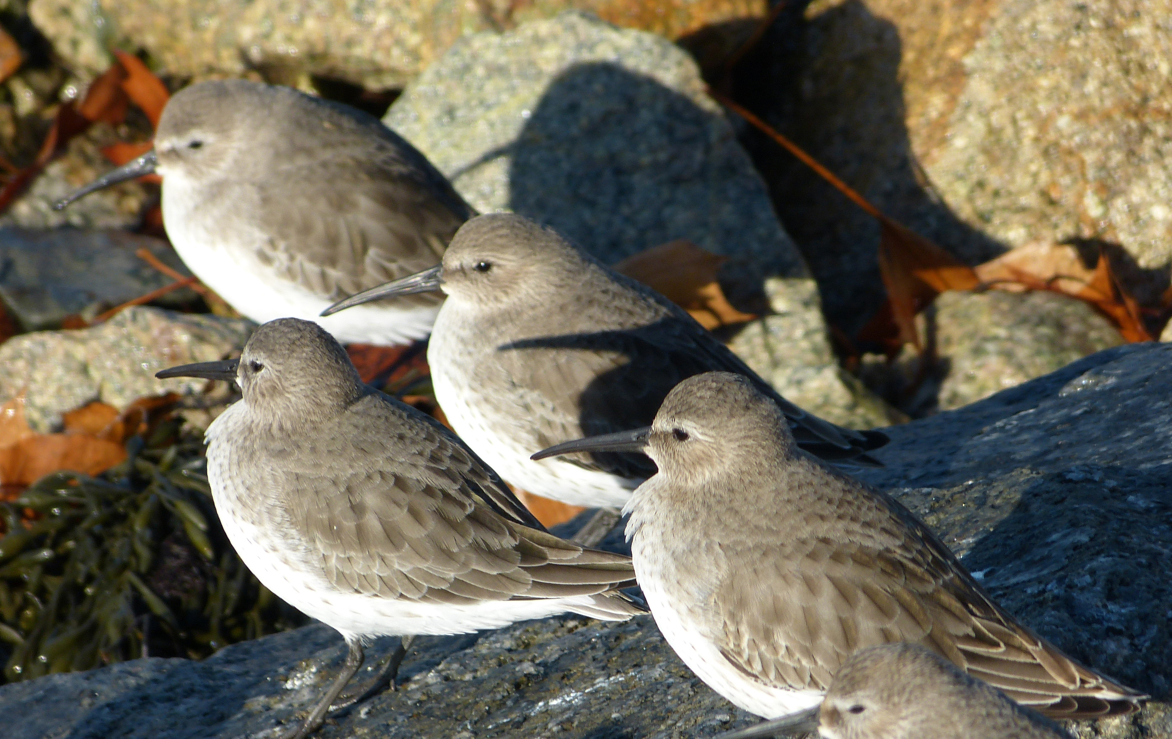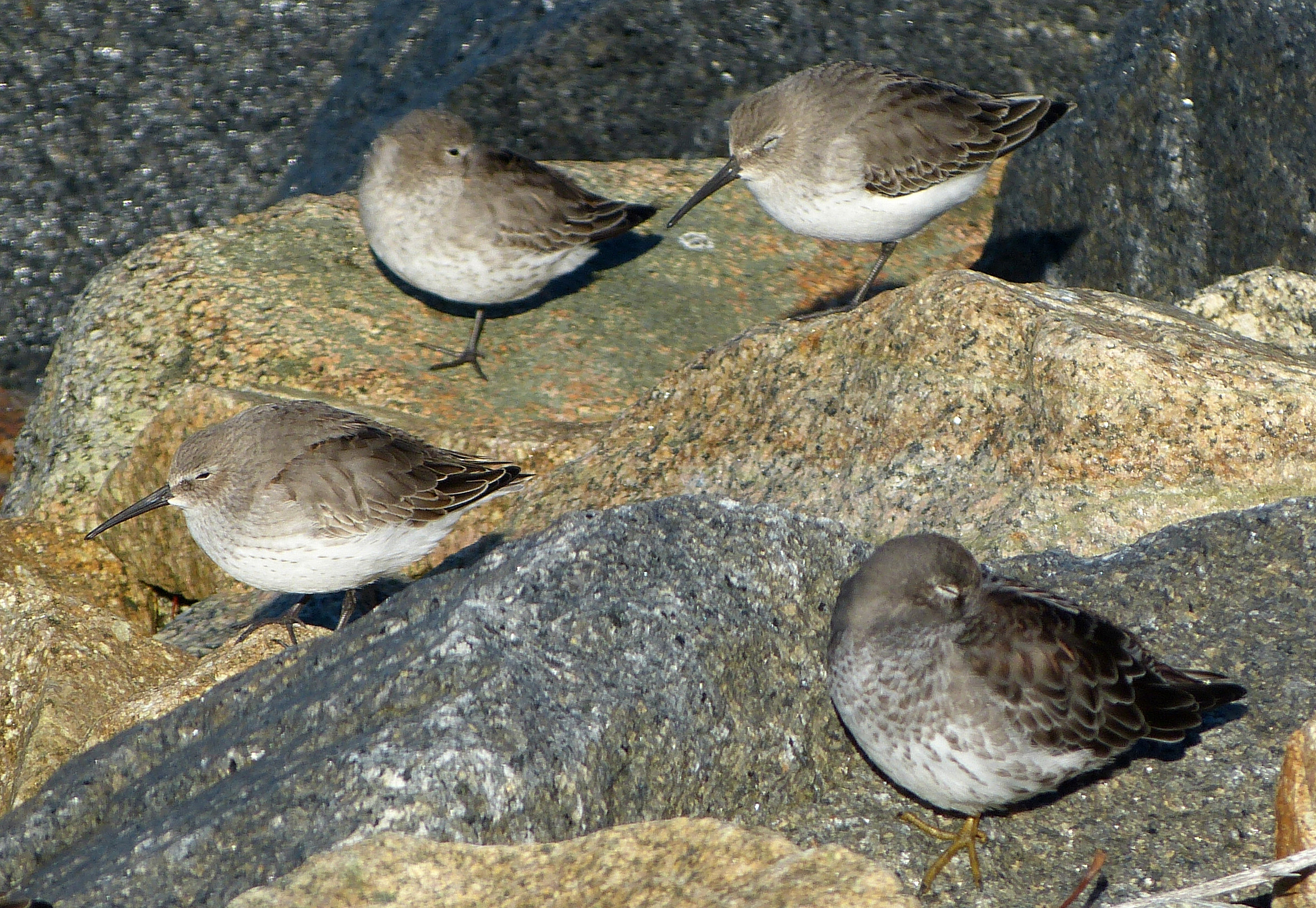 The difference in the color and thickness of the legs and feet and the darkness of the plumage is seen clearly in this shot of three Dunlins left and a Purple Sandpiper right