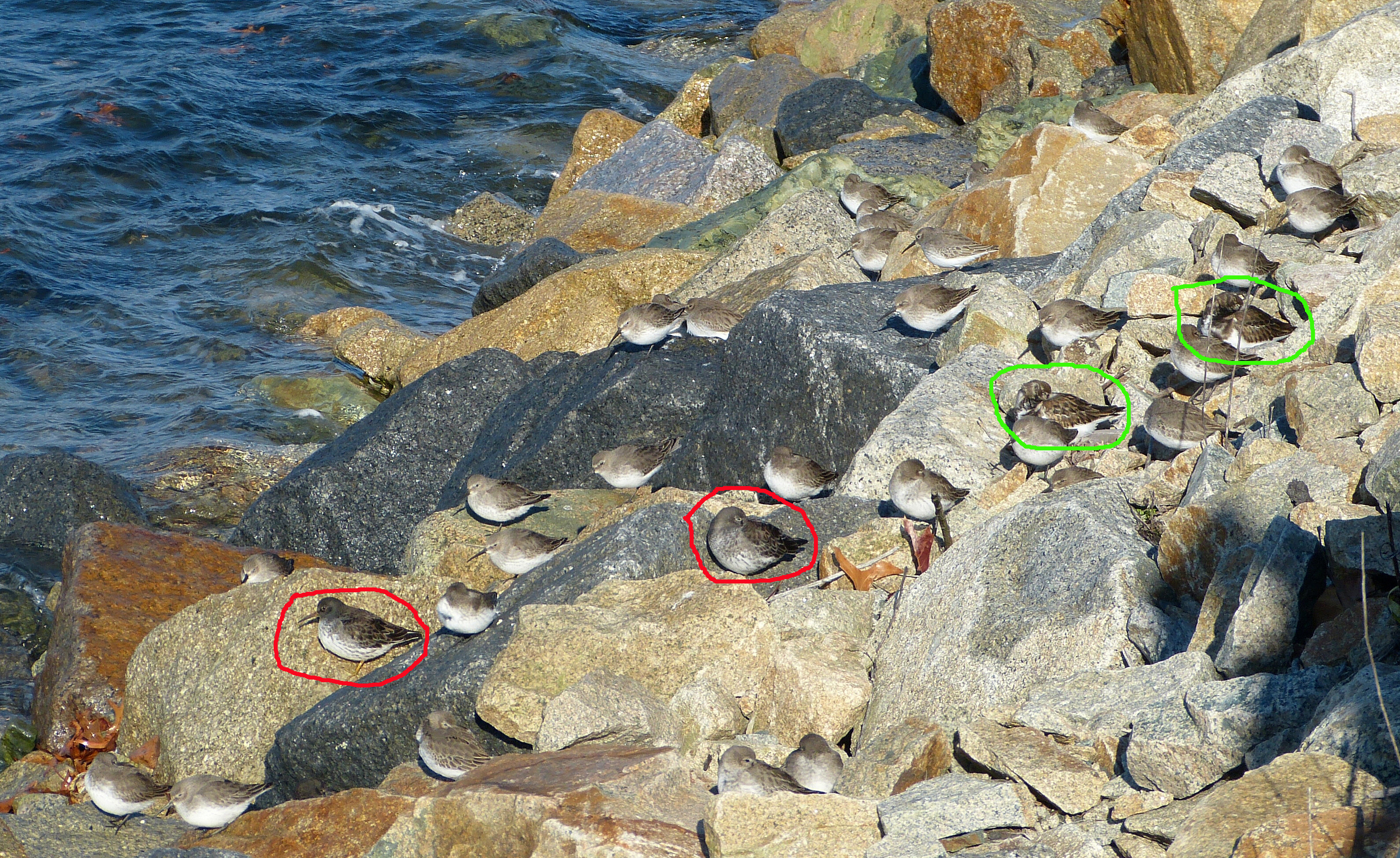 Among the many Dunlins are two Purple Sandpipers, circled in red, and two Ruddy Turnstones, in green. Had you spotted them?