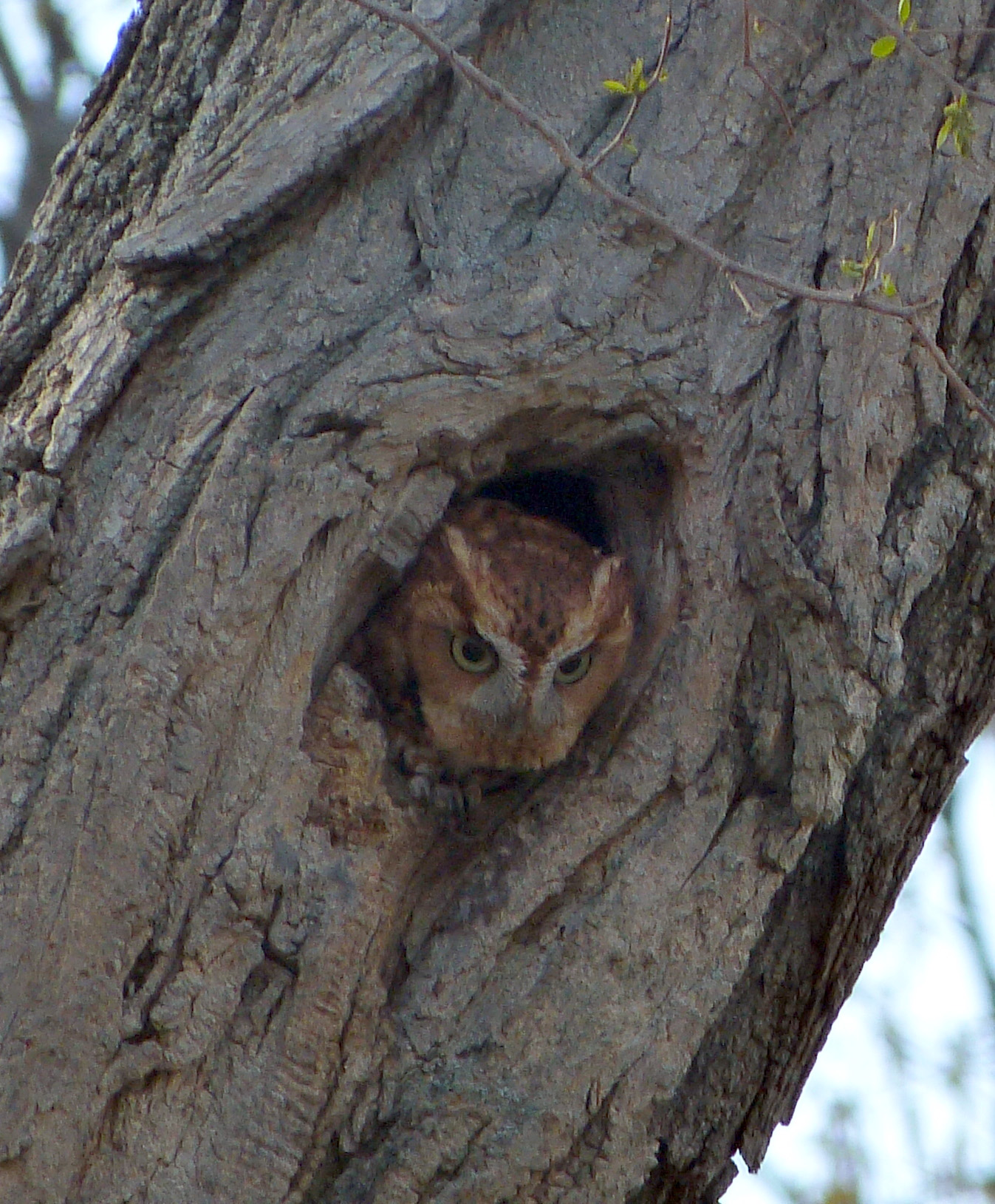 Since my last post about this owl there has been some interesting new information. Two competent birders witnessed the owl mating near the hole on several different days in late February, confirming it was a female. Then there were several weeks where the bird was not reported; I theorized that she had left the hole and gone elsewhere to make a nest. But now the owl, nicknamed “Screechy” by visitor staff, is being seen regularly. In past years a red morph screech frequented the hole in the winter but was never seen this far into spring. Could she be on eggs; now owlets? Or was it not a successful mating, and she is just hanging around in the roost hole feeling sorry for herself? Perhaps we will learn more as fledging time arrives, in mid to late May or early June.