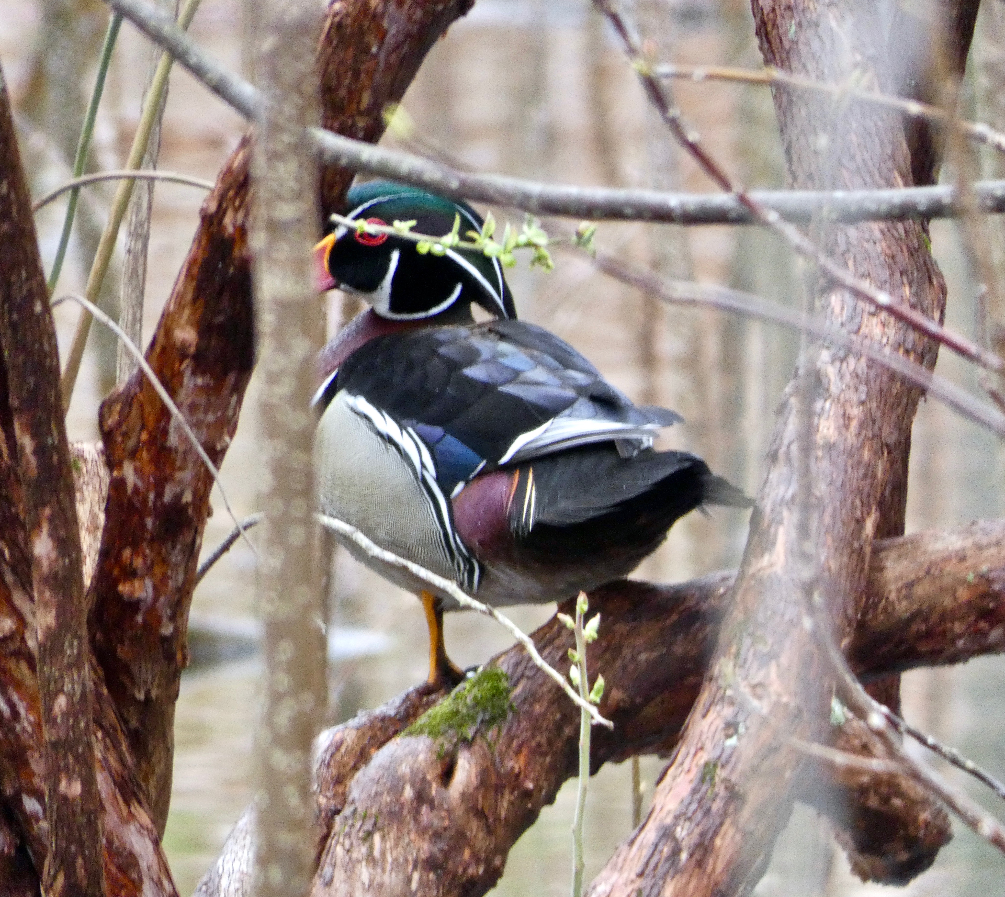 Male Wood Duck sitting on a branch in the Leitneria Swamp in the Arboretum