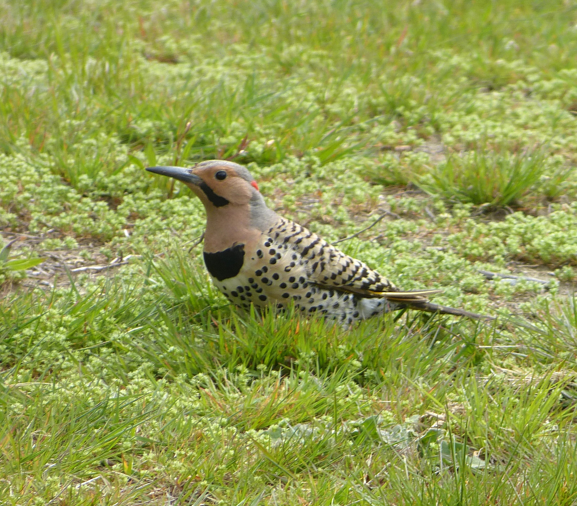 We had great looks at a Red-bellied Woodpecker and a bunch of Northern Flickers. Four of the flickers were paired up on the ball field grass. From a distance it was hard to tell whether we were watching males in territorial battle or males displaying for a female but they were having at it with gusto!