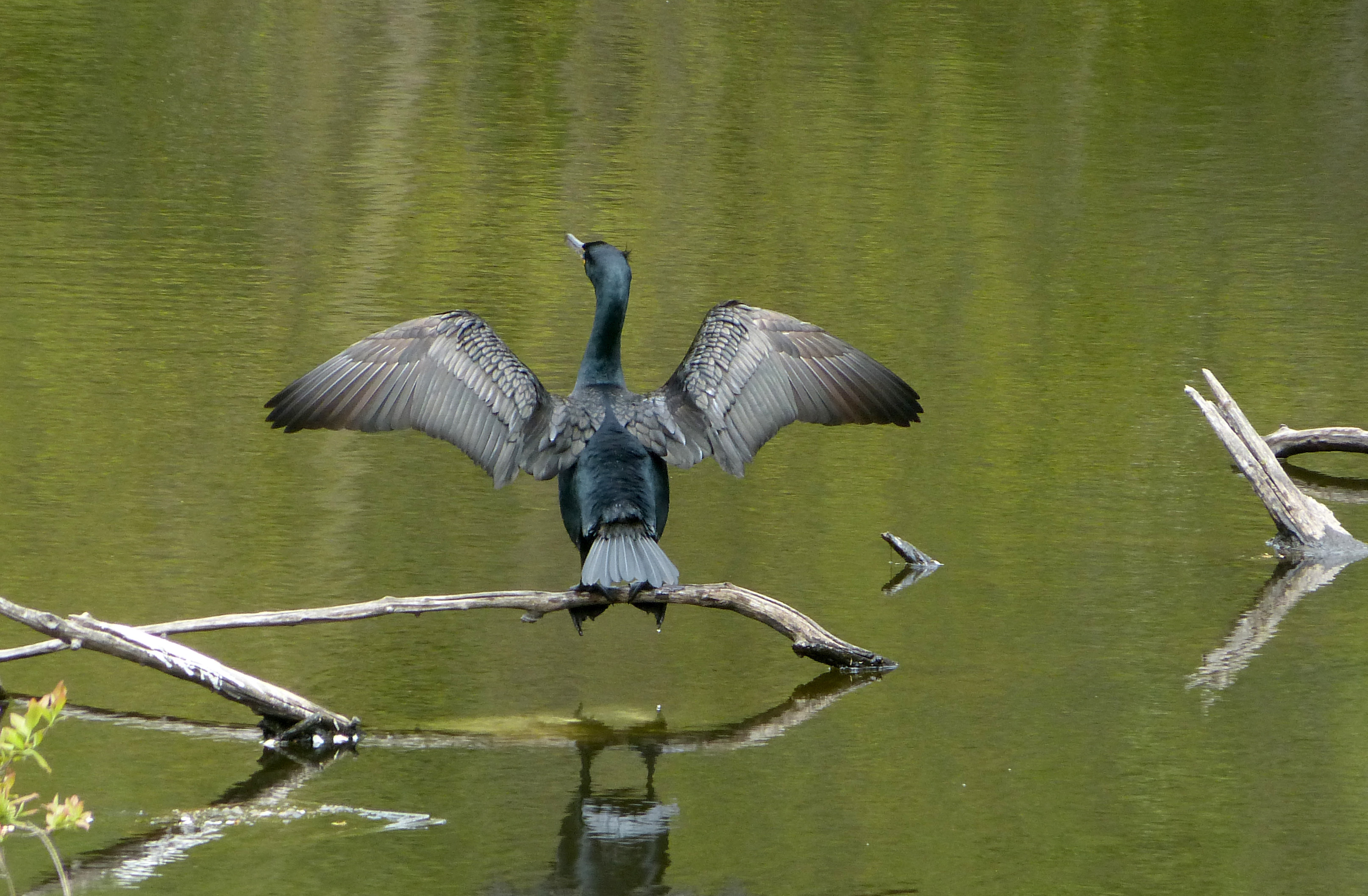 Cormorants often stand in the sun with their wings spread out to dry. They have less preen oil than other birds, so their feathers can get soaked rather than shedding water.