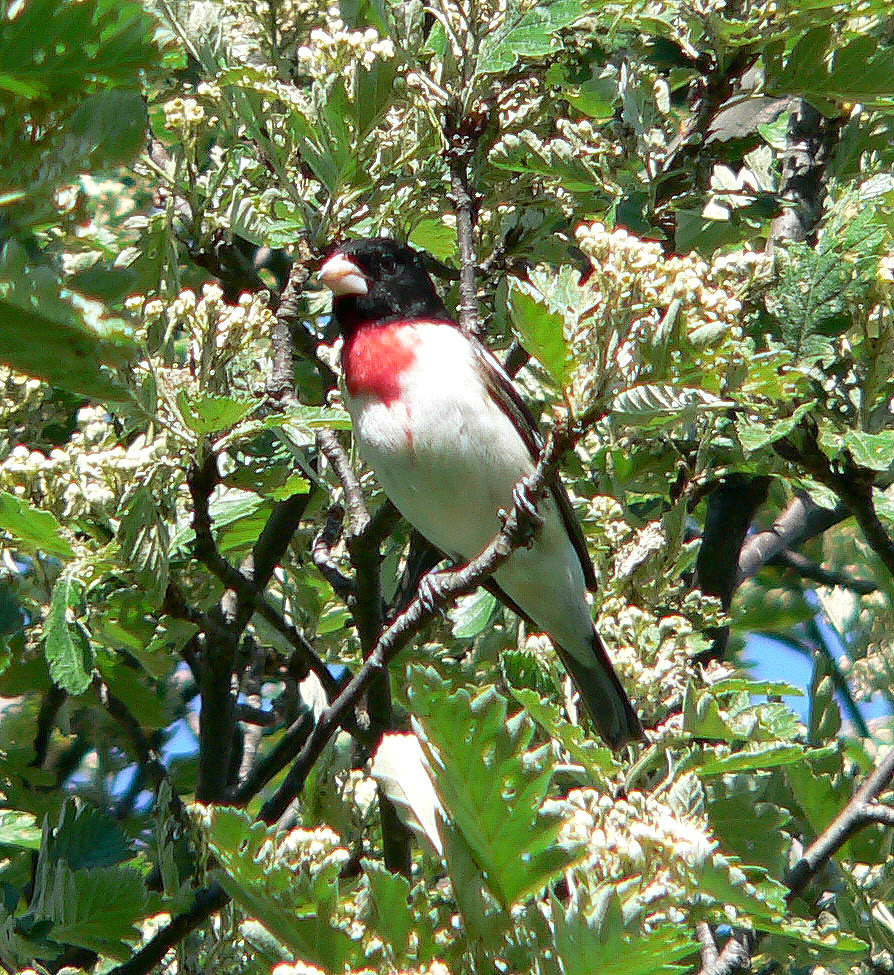A Rose-breasted Grosbeak was high up in a tree but easily seen, and it sang endlessly. Such a SMART beautiful bird: